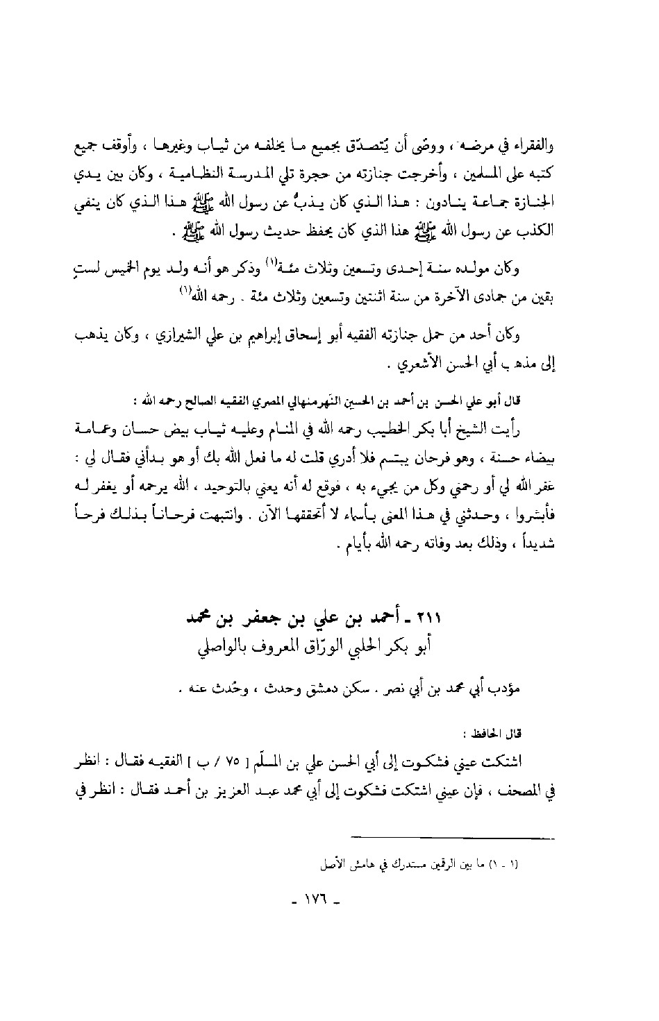 والفقراء في مرضه، ووصى أن يتصدق بجميع ما يخلفه من ثياب وغيرها، وأوقف جميع كتبه على المسلمين، وأخرجت جنازته من حجرة تلي المدرسة النظامية، وكان بين يدي الجنازة جماعة ينادون: هذا الذي كان يذب عن رسول الله صَلَّى اللهُ عَلَيْهِ وَسَلَّمَ هذا كان ينفي الكذب عن رسول الله صَلَّى اللهُ عَلَيْهِ وَسَلَّمَ هذا الذي كان يحفظ حديث رسول الله صَلَّى اللهُ عَلَيْهِ وَسَلَّمَ.