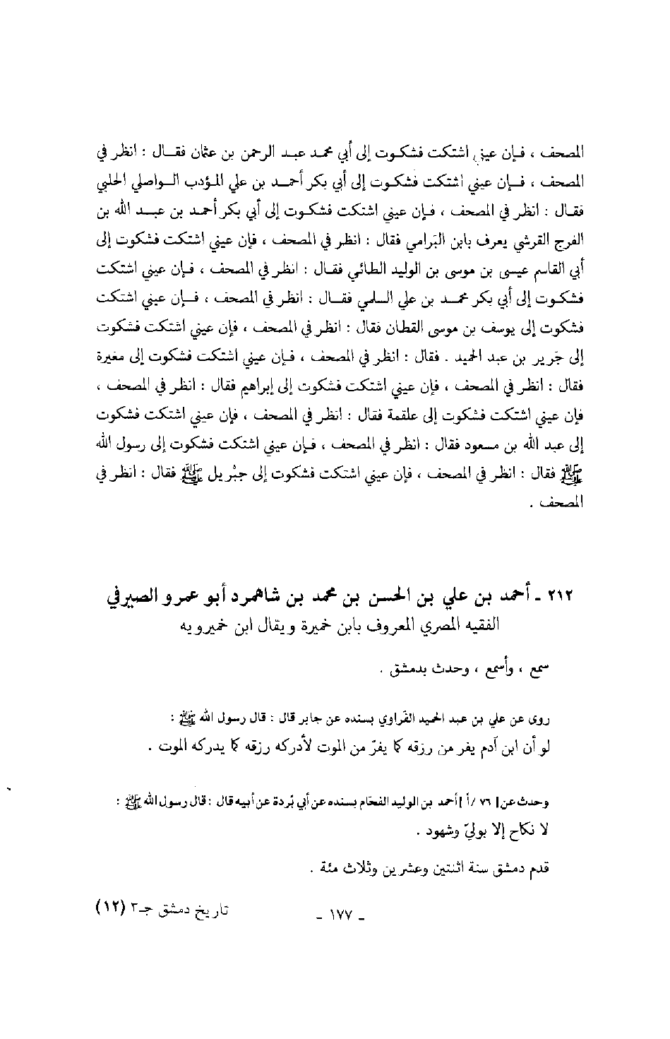 المصحف، فإن عيني اشتكت فشكوت إلى أبي محمد عبد العزيز بن أحمد فقال: انظر في المصحف، فإن عيني اشتكت فشكوت إلى أبي محمد عبد الرحمن بن عثمان فقال: انظر في المصحف، فإن عيني اشتكت فشكوت إلى أبي أحمد بن علي المؤدب الواصلي الحلبي فقال: انظر في المصحف، فإن عيني اشتكت فشكوت إلى أبي بكر أحمد بن عبد الله بن الفرج القرشي يعرف بابن البرامي فقال: انظر في المصحف، فإن عيني اشتكت فشكوت إلى أبي القاسم عيسى بن موسى بن الوليد الطائي فقال: انظر في المصحف، فإن عيني اشتكت فشكوت إلى يوسف بن موسى القطان فقال: انظر في المصحف، فإن عيني اشتكت فشكوت إلى جرير بن عبد الحميد. فقال: انظر في المصحف فإن عيني اشتكت فشكوت إلى مغيرة فقال: انظر في المصحف، فإن عيني اشتكت فشكوت إلى إبراهيم فقال: انظر في المصحف، فإن عيني اشتكت فشكوت إلى علقمة فقال: انظر في المصحف، فإن عيني اشتكت فشكوت إلى رسول الله صَلَّى اللهُ عَلَيْهِ وَسَلَّمَ فقال: انظر في المصحف، فإني عيني اشتكت فشكوت إلى جبريل صَلَّى اللهُ عَلَيْهِ وَسَلَّمَ فقال: انظر في المصحف.
