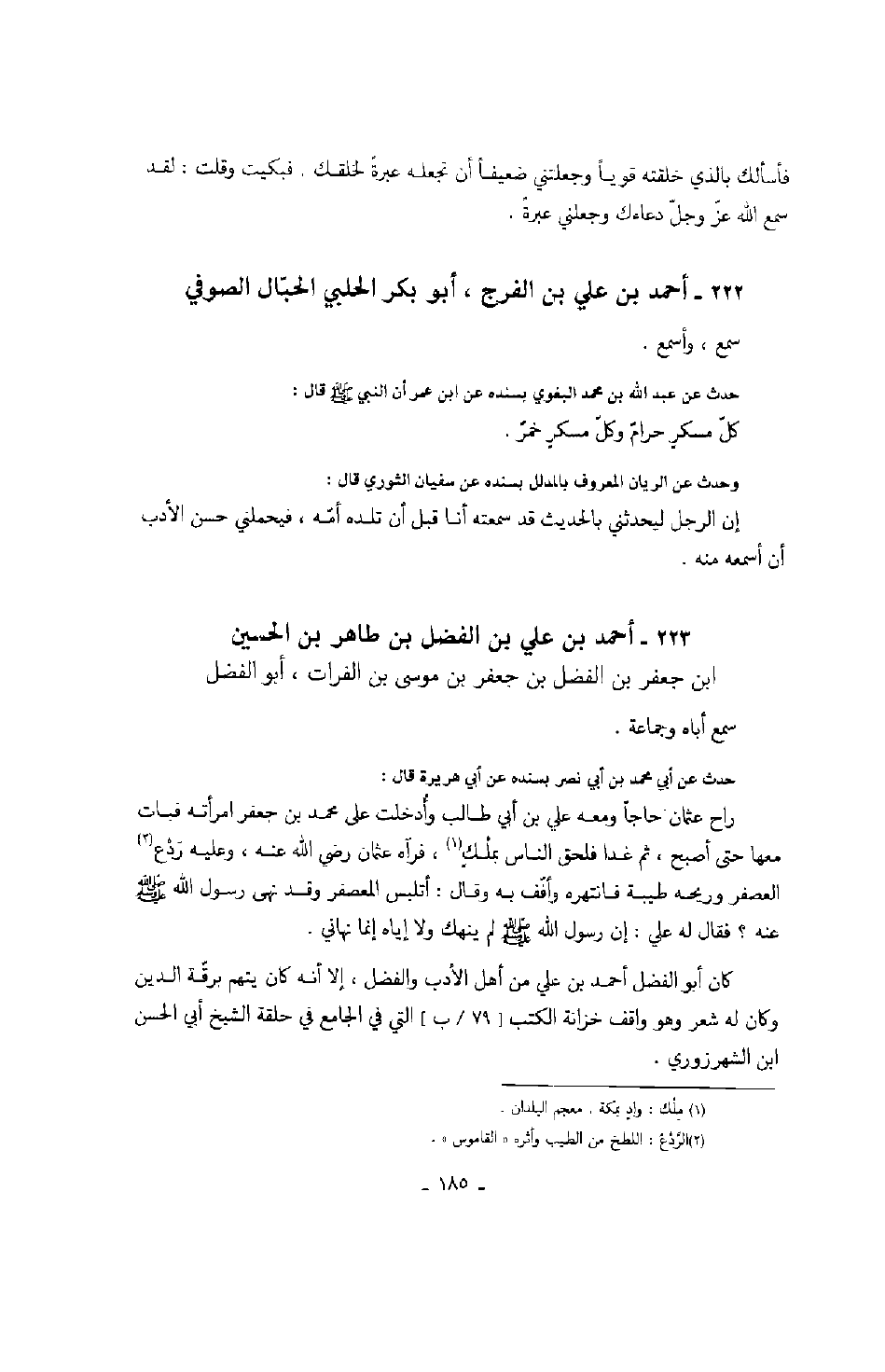 حدث عن عبد الله بن محمد البغوي بسنده عن ابن عمر أن النبي صَلَّى اللهُ عَلَيْهِ وَسَلَّمَ قال: كل مسكرٍ حرامٌ وكل مسكرٍ خمرٌ.