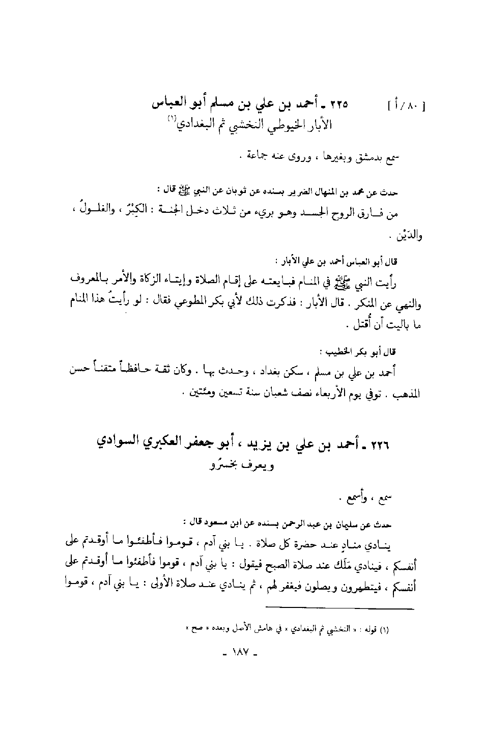 حدث عن محمد بن المنهال الضرير بسنده عن ثوبان عن النبي صَلَّى اللهُ عَلَيْهِ وَسَلَّمَ قال: من فارق الروح الجسد وهو بريء من ثلاث دخل الجنة: الكبر، والغلول، والدين.