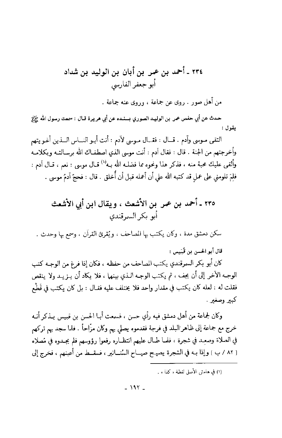 حدث عن أبي حفص عمر بن الوليد الصوري بسنده عن أبي هريرة قال: سمعت رسول الله صَلَّى اللهُ عَلَيْهِ وَسَلَّمَ يقول: التقى موسى وآدم. قال: فقال موسى لآدم: أنت أبو الناس الذين أغويتهم وأخرجتهم من الجنة. قال: فقال آدم: أنت موسى الذي اصطفاك الله برسالته وبكلامه وألقى عليك محبة منه، فذكر هذا ونحوه مما فضله الله به قال موسى: نعم، قال آدم: فلم تلومني على عملٍ قد كتبه الله علي أن أعمله قبل أن أخلق. قال: فحج آدم موسى.