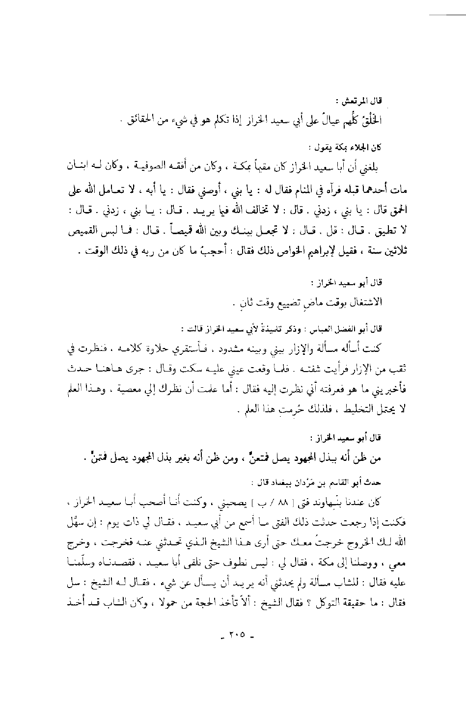 بلغني أن أبا سعيد الخراز كان مقيماً بمكة، وكان من أفقه الصوفية، وكان له ابنان مات أحدهما قبله فرآه في المنام فقال له: يا بني، أوصني فقال: يا أبه، لا تعامل الله على الحمق قال: يا بني، زدني. قال: لا تخالف الله فيما يريد. قال: يا بني، زدني. قال: لا تطيق. قال: قل. قال: لا تجعل بينك وبين الله قميصاً. قال: فما لبس القميص ثلاثين سنة، فقيل لإبراهيم الخواص ذلك فقال: أحجب ما كان من ربه في ذلك الوقت.