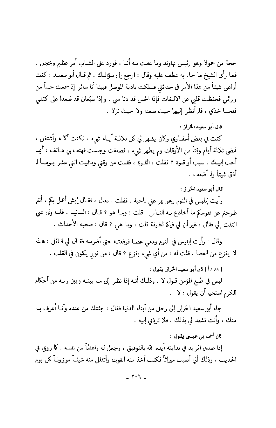 حجة من حمولا وهو رئيس نهاوند وما علمت به أنا، فورد على الشاب أمر عظيم وخجل. فلما رأى الشيخ ما جاء به عطف عليه وقال: ارجع إلى سؤالك. ثم قال أبو سعيد: كنت أراعي شيئاً من هذا الأمر في حداثتي فسلكت بادية الموصل فبينا أنا سائر إذ سمعت حساً من ورائي فحفظت قلبي عن الالتفات فإذا الحس قد دنا مني، وإذا سبعان قد صعدا على كتفي فلحسا خدي، فلم أنظر إليهما حيث صعدا ولا حيث نزلا.