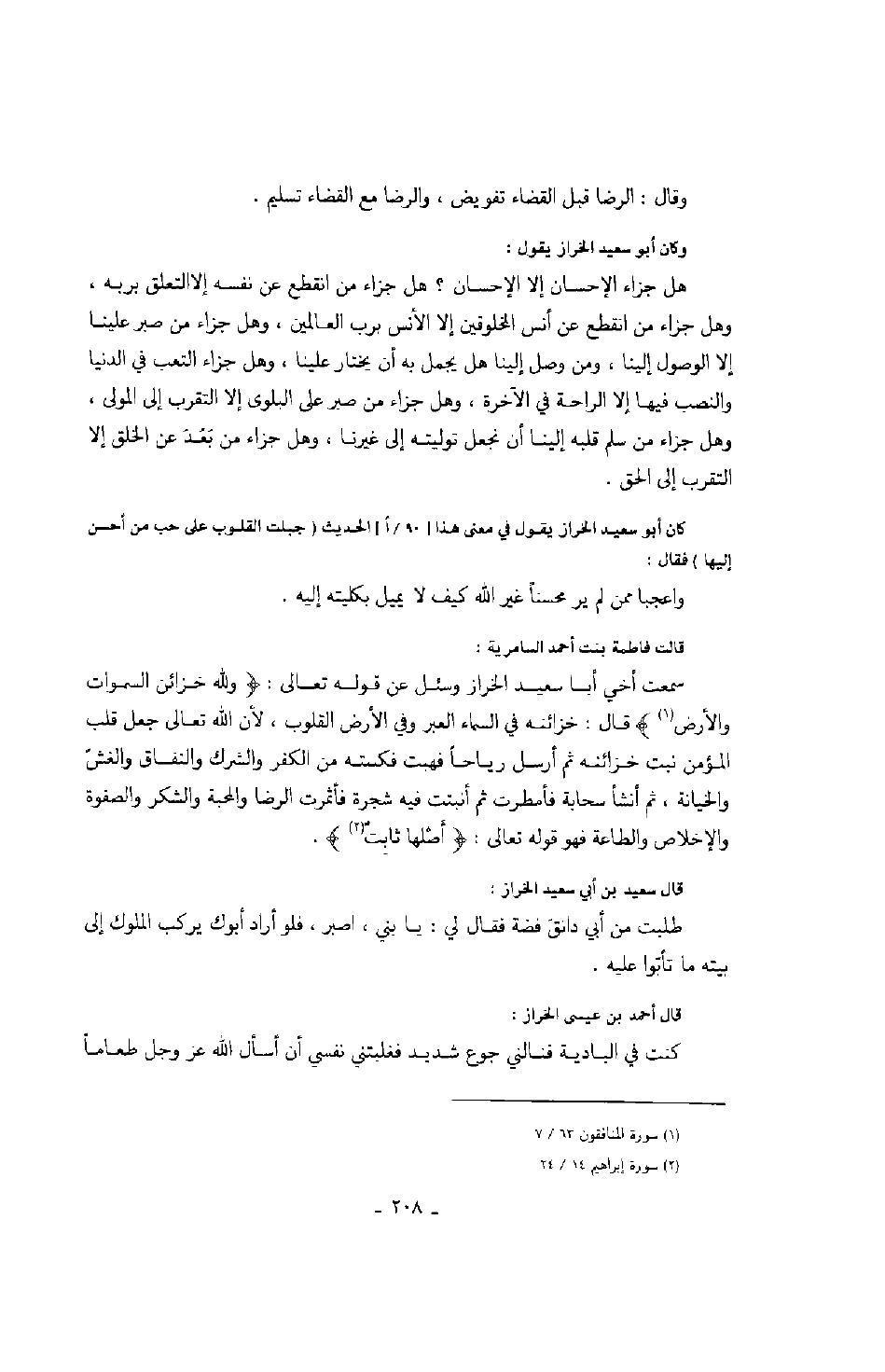 وكان أبو سعيد الخراز يقول: هل جزاء الإحسان إلا الإحسان؟ هل جزاء من انقطع عن نفسه إلا التعلق بربه، وهل جزاء من انقطع عن أنس المخلوقين إلا الأنس برب العالمين، وهل جزاء من صبر علينا إلا الوصول إلينا، ومن وصل إلينا هل يجمل به أن يختار علينا، وهل جزاء التعب في الدنيا والنصب فيها إلا الراحة في الآخرة، وهل جزاء من صبر على البلوى إلا التقرب إلى المولى، وهل جزاء من سلم قلبه إلينا أن نجعل توليته إلى غيرنا، وهل جزاء من بعد عن الخلق إلا التقرب إلى الحق.