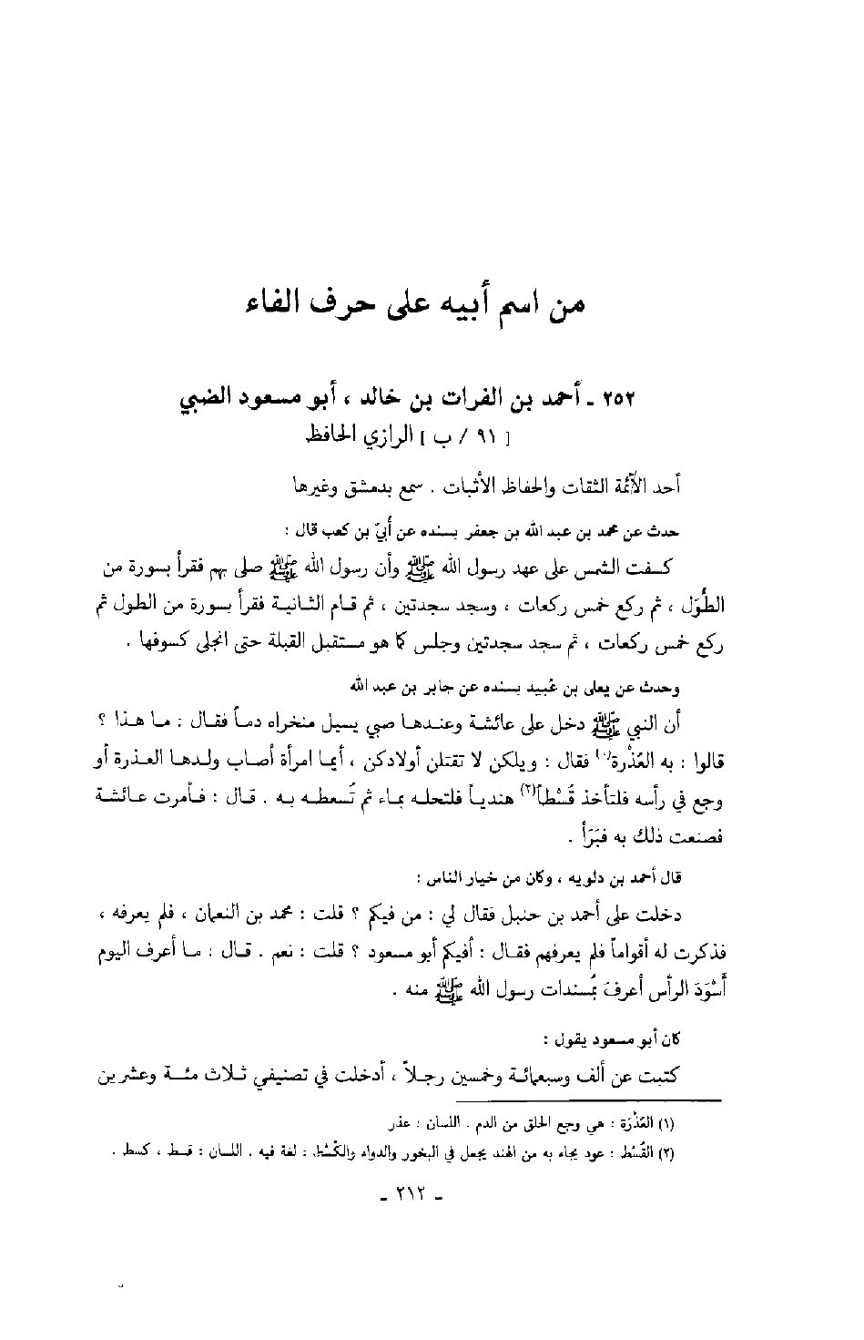 أبو مسعود الضبي الرازي الحافظ أحد الأئمة الثقات والحفاظ الأثبات. سمع بدمشق وغيرها حدث عن محمد بن عبد الله بن جعفر بسنده عن أبي بن كعب قال: كسفت الشمس على عهد رسول الله صَلَّى اللهُ عَلَيْهِ وَسَلَّمَ وأن رسول الله صَلَّى اللهُ عَلَيْهِ وَسَلَّمَ صلى بهم فقرأ بسورة من الطول، ثم ركع خمس ركعات، وسجد سجدتين، ثم قام الثانية فقرأ بسورة من الطول ثم ركع خمس ركعات، ثم سجد سجدتين وجلس كما هو مستقبل القبلة حتى انجلى كسوفها.