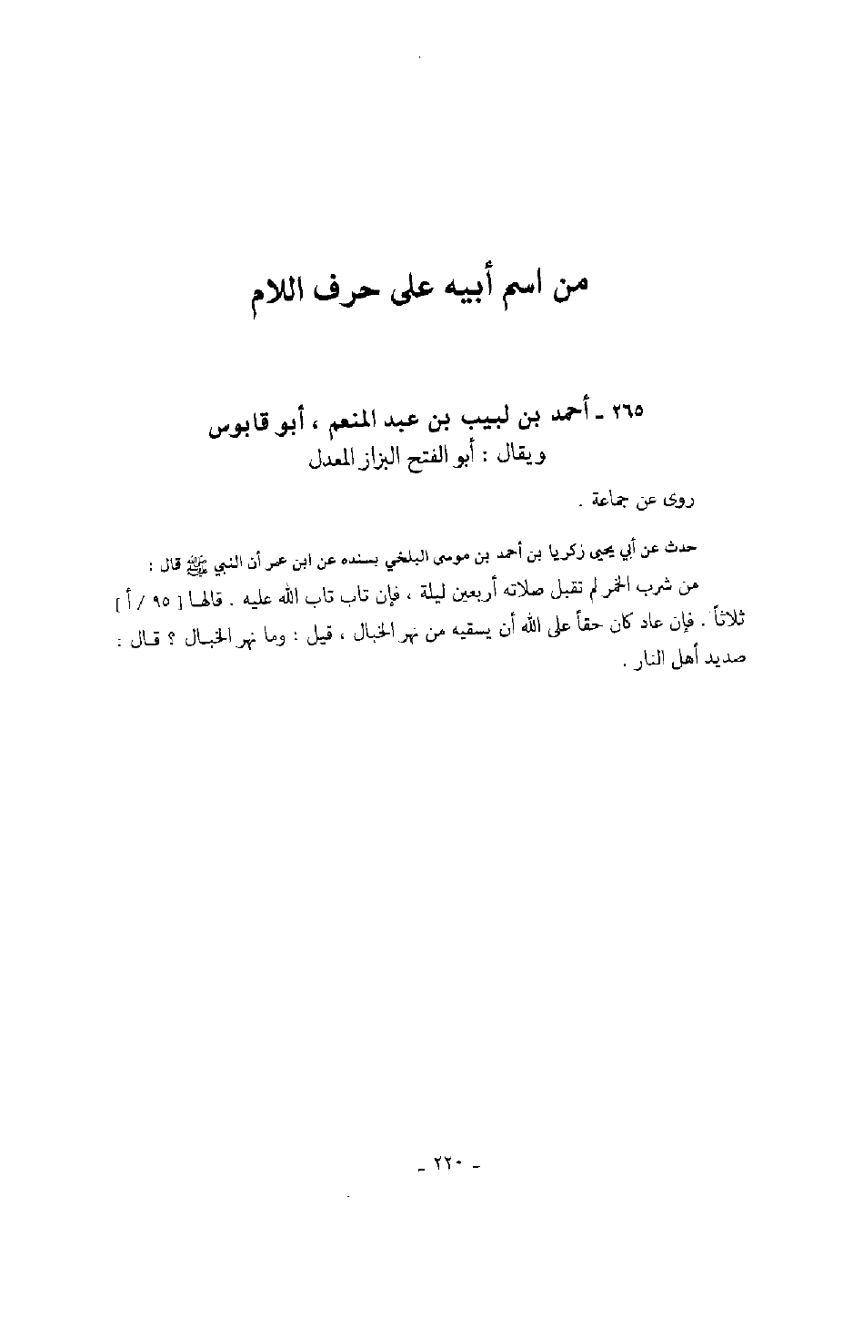حدث عن أبي يحيى زكريا بن أحمد بن موسى البلخي بسنده عن ابن عمر أن النبي صَلَّى اللهُ عَلَيْهِ وَسَلَّمَ قال: من شرب الخمر لم تقبل صلاته أربعين ليلة، فإن تاب تاب الله عليه. قالها ثلاثاً. فإن عاد كان حقاً على الله أن يسقيه من نهر الخبال، قيل: وما نهر الخبال؟ قال: صديد أهل النار.