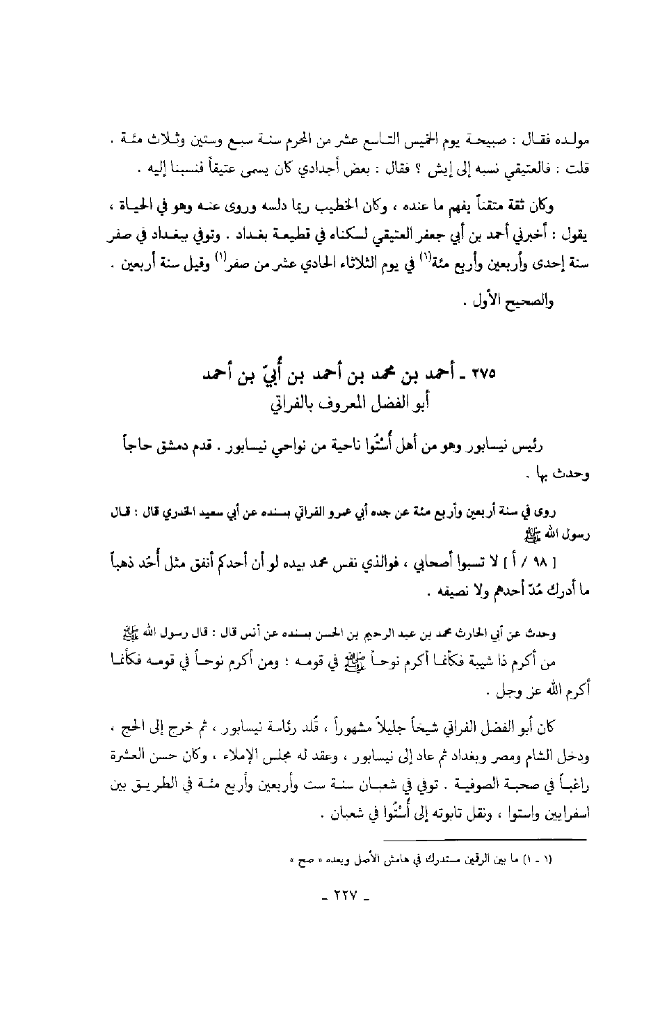 روى في سنة أربعين وأربع مئة عن جده أبي عمرو الفراتي بسنده عن أبي سعيد الخدري قال: قال رسول الله صَلَّى اللهُ عَلَيْهِ وَسَلَّمَ لا تسبوا أصحابي، فوالذي نفس محمد بيده لو أن أحدكم أنفق مثل أحد ذهباً ما أدرك مد أحدهم ولا نصيفه.