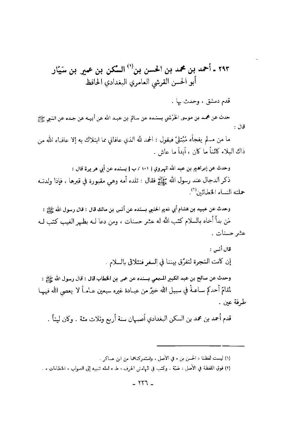 وحدث عن إبراهيم بن عبد الله الهروي بسنده عن أنس بن مالك قال: قال رسول الله صَلَّى اللهُ عَلَيْهِ وَسَلَّمَ: من بدأ أخاه بالسلام كتب الله له عشر حسنات، ومن دعا له بظهر الغيب كتب له عشر حسنات.