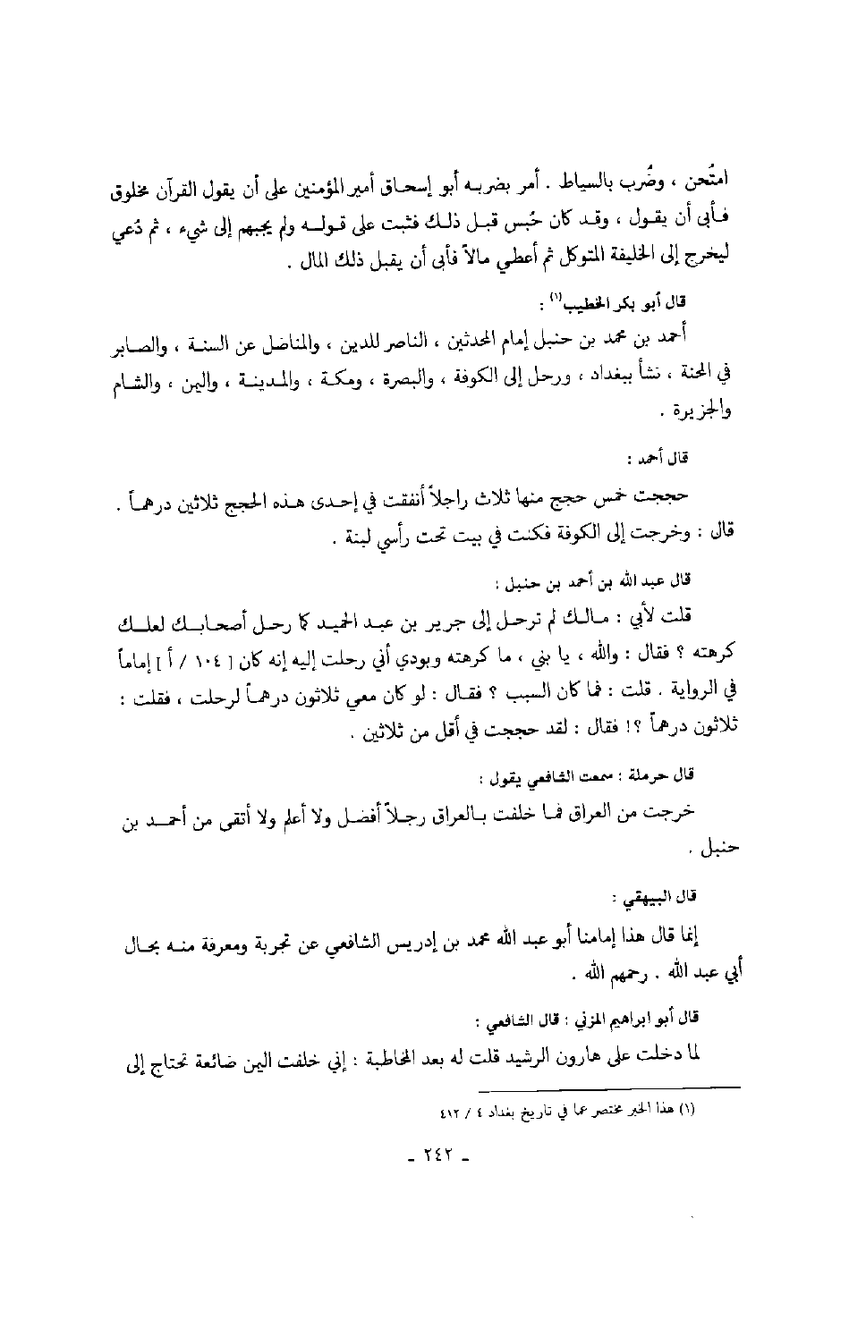قال أبو بكر الخطيب: أحمد بن محمد بن حنبل إمام المحدثين، الناصر للدين، والمناضل عن السنة، والصابر في المحنة، نشأ ببغداد، ورحل إلى الكوفة، والبصرة، ومكة، والمدينة، واليمن، والشام والجزيرة.