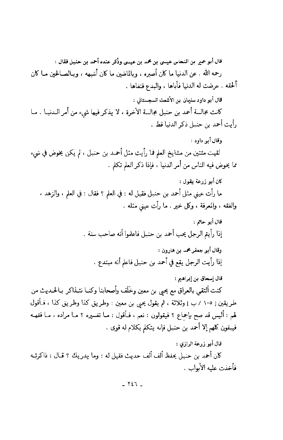 كان أبو زرعة يقول: ما رأت عيني مثل أحمد بن حنبل فقيل له: في العلم؟ فقال: في العلم، والزهد، والفقه، والمعرفة، وكل خير. ما رأيت عيني مثله.