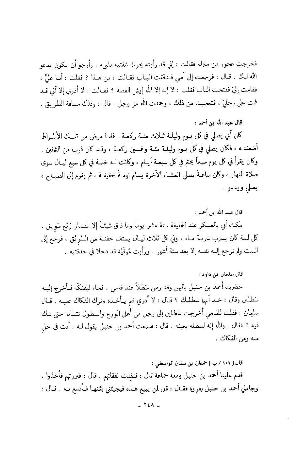 مكث أبي بالعسكر عند الخليفة ستة عشر يوماً وما ذاق شيئاً إلا مقدار ربع سويق. كل ليلة كان يشرب شربة ماء، وفي كل ثلاث ليال يستف حفنة من السويق، فرجع إلى البيت ولم ترجع إليه نفسه إلا بعد ستة أشهر. ورأيت موقيه قد دخلا في حدقتيه.