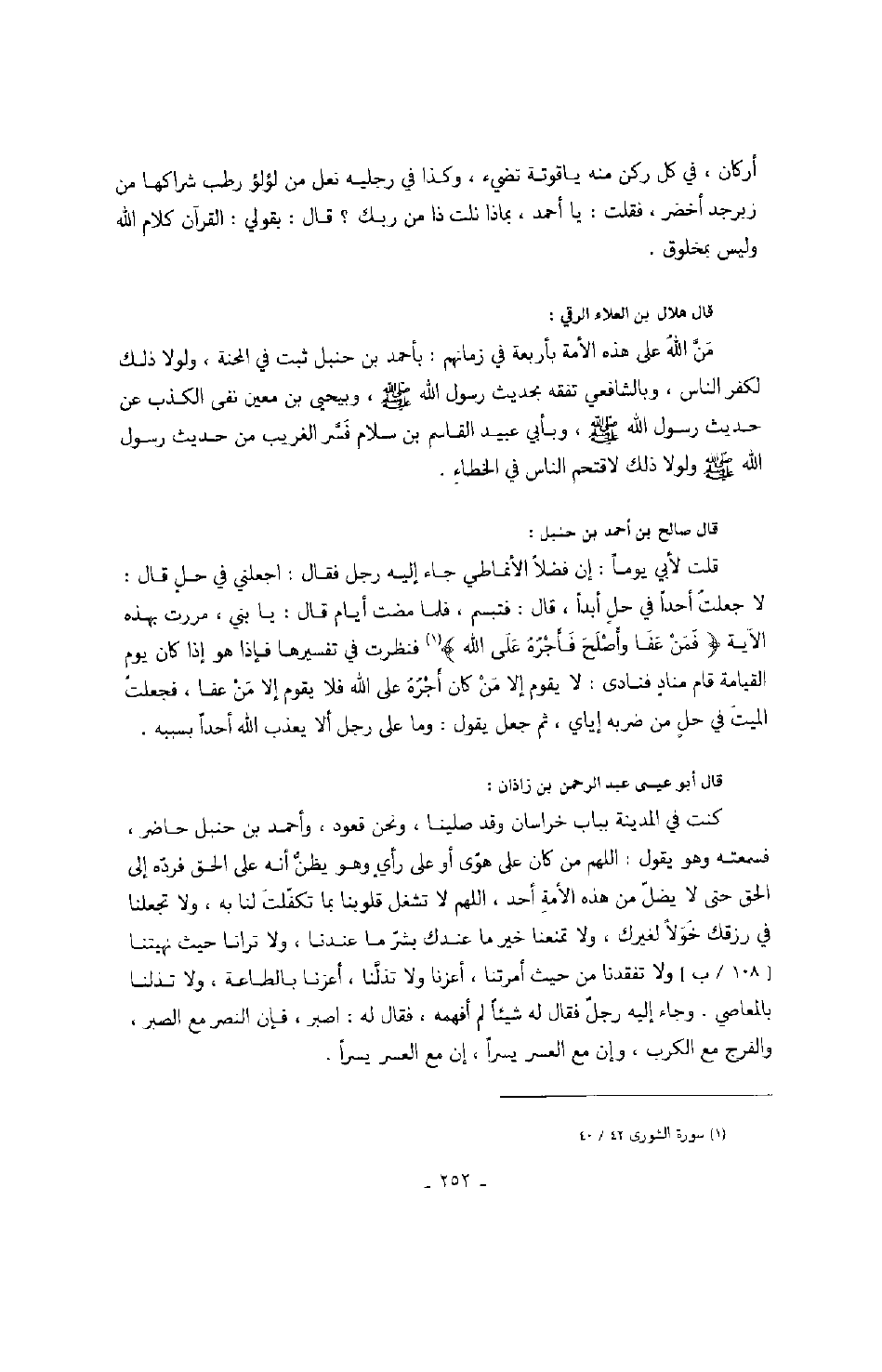 قال صالح بن أحمد بن حنبل: قلت لأبي يوماً: إن فضلاً الأنماطي جاء إليه رجل فقال: اجعلني في حلٍ قال: لا جعلت أحداً في حل أبداً، قال: فتبسم، فلما مضت أيام قال: يا بني، مررت بهذه الآية " فمن عفا وأصلح فأجره على الله " فنظرت في تفسيرها فإذا هو إذا كان يوم القيامة قام منادٍ فنادى: لا يقوم إلا من كان أجره على الله فلا يقوم إلا من عفا، فجعلت الميت في حلٍ من ضربه إياي، ثم جعل يقول: وما على رجل ألا يعذب الله أحداً بسببه.