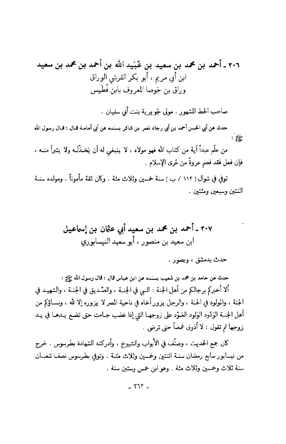 حدث عن حامد بن محمد بن شعيب بسنده عن ابن عباس قال: قال رسول الله صَلَّى اللهُ عَلَيْهِ وَسَلَّمَ: ألا أخبركم برجالكم من أهل الجنة: النبي في الجنة، والصديق في الجنة، والشهيد في الجنة، والمولود في الجنة، والرجل يزور أخاه في ناحية المصر لا يزوره إلا الله، ونساؤكم من أهل الجنة الودود الولود العود على زوجها التي إذا غضب جاءت حتى تضع يدها في يد زوجها ثم تقول: لا أذوق غمضاً حتى ترضى.