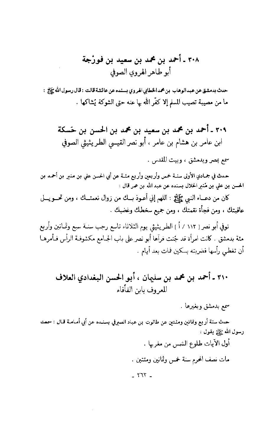 أبو طاهر الهروي الصوفي حدث بدمشق عن عبد الوهاب بن محمد الخطابي الهروي بسنده عن عائشة قالت: قال رسول الله صَلَّى اللهُ عَلَيْهِ وَسَلَّمَ: ما من مصيبة تصيب المسلم إلا كفر الله بها عنه حتى الشوكة يشاكها.