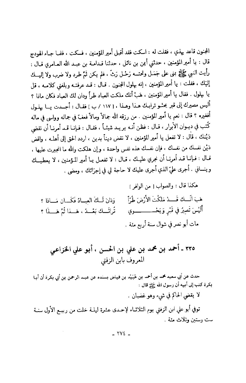 أبو علي الخزاعي المعروف بابن الزفتي حدث عن أبي سعيد محمد بن أحمد بن عبيد بن فياض بسنده عن عبد الرحمن بن أبي بكرة أن أبا بكرة كتب إلى أبيه أن رسول الله صَلَّى اللهُ عَلَيْهِ وَسَلَّمَ قال: لا يقضي الحاكم في شيء وهو غضبان.