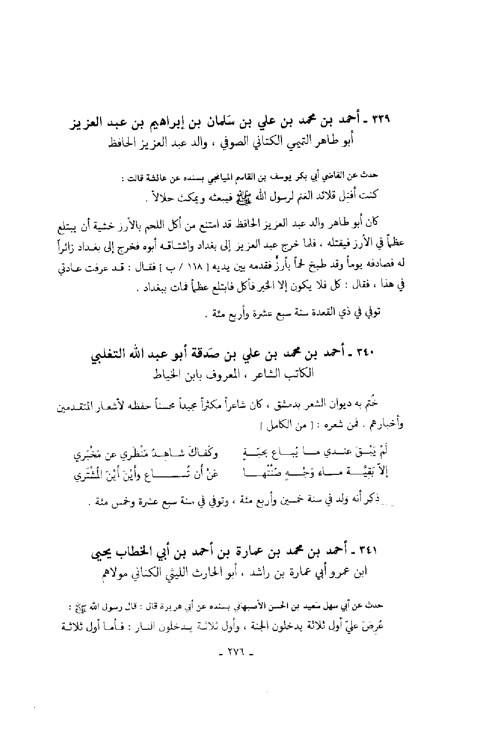 ابن إبراهيم بن عبد العزيز أبو طاهر التميمي الكتاني الصوفي، والد عبد العزيز الحافظ حدث عن القاضي أبو بكر يوسف بن القاسم الميانجي بسنده عن عائشة قالت: كنت أفتل قلائد الغنم لرسول الله صَلَّى اللهُ عَلَيْهِ وَسَلَّمَ فيبعثه ويمكث حلالاً.