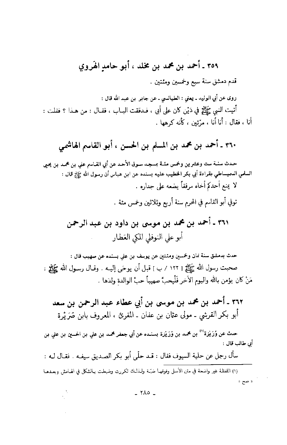 حدث عن عبد الواحد بن شعيب الجبلي بجبلة بسنده عنه أبي موسى قال: قال رسول الله صَلَّى اللهُ عَلَيْهِ وَسَلَّمَ: احتج آدم وموسى فقال موسى: أنت آدم الذي خلقك الله بيده، وأسجد لك ملائكته عملت الخطيئة التي أخرجتك من الجنة. قال آدم: أنت موسى الذي اصطفاك الله برسالته، وأنزل عليك التوارة، وكلمك تكليماً. فبكم خطيئتي سبقت خلقي؟ قال رسول الله صَلَّى اللهُ عَلَيْهِ وَسَلَّمَ فحج آدم موسى.