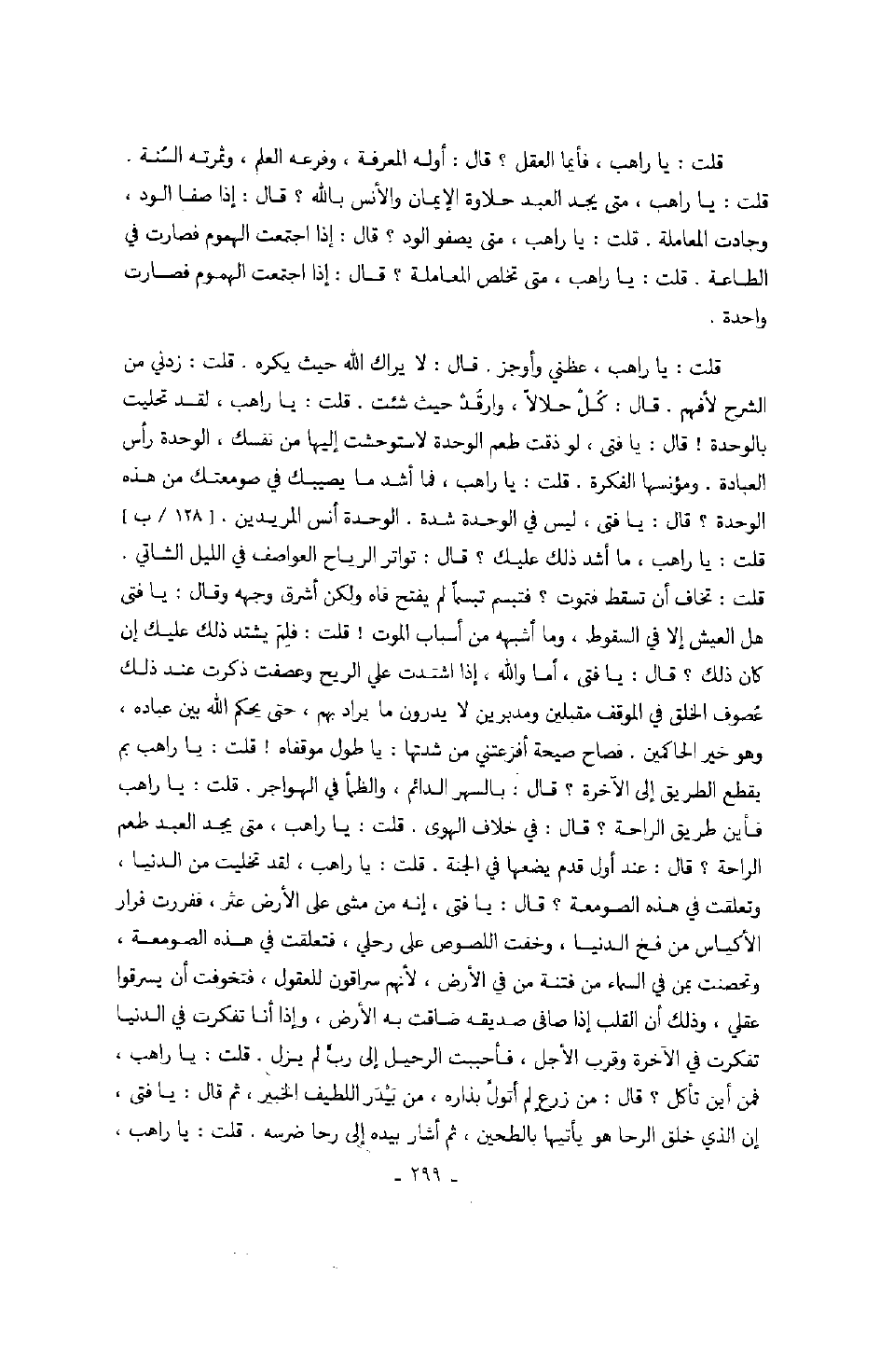 واعلم يا فتى أن شدة الحساب ومعاينة الأهوال مع الحمل الثقيل سيثقل اليوم على المسرفين بما عملوا ومرحوا في الأرض بغير ما أمروا. يا فتى، اجتناب المحارم رأس العبادة وسيعلم المتقون بما صبروا على سجع الطريق والظمأ في الهواجر والقيام على الأقدام في ظلم الدجى وإجاعة الأكباد وعري الأجساد، وذلك أن الله عدل في قضائه سابق في مقاله، لا يضيع أجر المحسين قلت: يا راهب، إني لأريد لنفسي شيئاً من المطعم والمشرب فلا يكفيني حتى تتوق نفسي إلى أكثر من ذلك. قال: يا فتى، إن نواصي العباد في يد الله عز وجل وقبضته فلا يجوزون من ذلك إلى غيره، قد قسم أرزاقهم وفرغ من آجالهم، تدبير