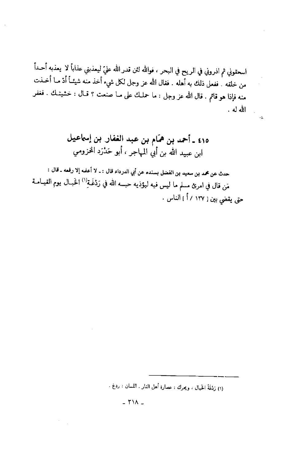 أبو الحسين الطائي المنبجي الشاهد المقرىء النحوي حدث عن أبي عبد الله محمد بن إبراهيم بن مروان بسنده عن عبد الله قال: قال رسول الله صَلَّى اللهُ عَلَيْهِ وَسَلَّمَ: لا تقتلوا الضفادع فإن نقيقها تسبيح.