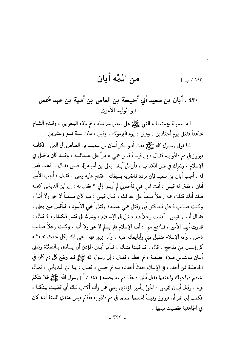 قال سعيد بن العاص: لما قتل أبي يوم بدر كنت في حجر عمي أبان بن سعيد، وكان ولي صدق، وإنه خرج تاجراً إلى الشام فمكث هنالك سنة، ثم قدم علينا، وكان شديد السب لرسول الله صَلَّى اللهُ عَلَيْهِ وَسَلَّمَ شديد الحرد عليه، فلما بلغني قدومه خرجت حتى جئته، فكان أول ما سأل عنه أن قال: ما فعل محمد؟ فقال عمي عبد الله بن سعيد: هو والله أعز ما كان قط، وأعلاه أمراً، والله فاعلٌ به وفاعل، فسكت ولم يسبه كما كان يفعل، وقام القوم فمكث ليالي، ثم أرسل إلى سراة بني أمية وقد صنع لهم طعاماً. فلما أكلوا قال: ما فعل رسول الله محمد؟ قالوا: فعل الله به وفعل، وقد أكثرت من السؤال عنه فما شأنك؟ فقال: شأني والله أني ما أرى شراً دخلتم إلا دخلت فيه، ولا شراً وخيراً تركتموه إلا تركته ولم أره خيراً، تعلمون أني كنت بقرية يقال لها بامردى وكان بها راهب لم ير له وجه مذ أربعين سنة.