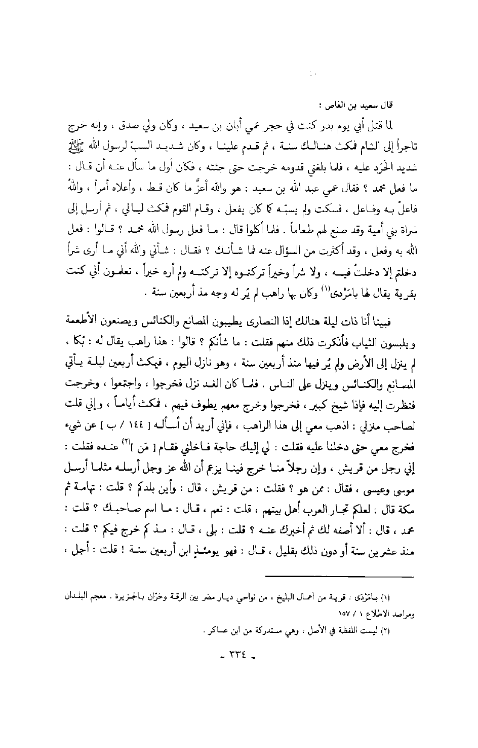 كان خالد بن سعيد وعمرو بن سعيد قد أسلما وهاجرا إلى أرض الحبشة، وأقام غيرهما من ولد أبي أحيحة سعيد بن العاص بن أمية على ما هم عليه، ولم يسلموا حتى كان نفير بدر، فلم يتخلف منهم أحد، خرجوا جميعاً في النفير إلى بدر، فقتل العاص بن سعيد على كفره، قتله علي بن أبي طالب، رضي الله عنه وعبيدة بن سعيد قتله الزبير بن العوام، وأفلت أبان بن سعيد فجعل خالد وعمرو يكتبان إلى أبان بن سعيد ويقولان: نذكرك الله أن تموت على ما مات عليه أبوك وعلى ما قتل عليه أخواك، فيغضب من ذلك ويقول: لا أفارق دين آبائي أبداً. وكان أبو أحيحة قد مات بمال له بالظريبة نحو الطائف وهو كافر، فأنشأ أبان بن سعيد يقول: من الطويل