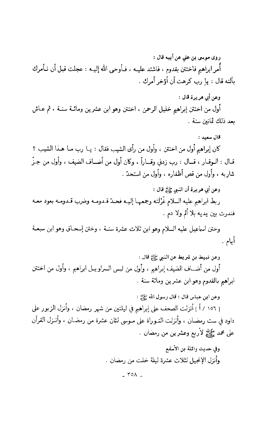 أنت سمعت هذا من رسول الله صَلَّى اللهُ عَلَيْهِ وَسَلَّمَ؟ قال: نعم. قال كعب لأبي هريرة: بأبي وأمي ألا أخبرك عن إسحاق بن إبراهيم النبي صَلَّى اللهُ عَلَيْهِ وَسَلَّمَ؟ قال أبو هريرة:: بلى. قال كعب: لما رأى إبراهيم النبي صَلَّى اللهُ عَلَيْهِ وَسَلَّمَ ذبحاً قال الشيطان: والله لئن لم أفتن عبده هذا آل إبراهيم لا أفتن منهم أحداً أبداً، فتمثل الشيطان لهم رجلاً يعرفونه، فأقبل حتى إذا خرج إبراهيم بإسحاق ليذبحه، دخل على سارة امرأة إبراهيم فقال لها: أين أصبح إبراهيم غادياً بإسحاق؟ قالت سارة: غدا به ليقضي حاجته. قال الشيطان: لا والله ما لذلك غدا به. قالت سارة: فلم غدا به؟ قال: غدا به ليذبحه. قالت سارة: وليس في ذلك شيء لم يكن ليذبح ابنه، قال الشيطان: بلى والله. قالت سارة: فلم يذبحه؟ قال: زعم أن ربه أمره بذلك، قالت سارة: فقد أحسن أن يطيع ربه إن كان أمره بذلك، فخرج الشيطان من عند سارة حتى إدرك إسحاق وهو يمشي على إثر أبيه، قال له: أين أصبح أبوك غادياً بك؟ قال غدا بي لبعض حاجته. قال الشيطان: لا والله ما غدا بك لبعض حاجته، ولكنه غدا بك ليذبحك. قال إسحاق: ما كان ليذبحني، قال: بلى، قال لم؟ قال: زعم أن ربه أمره بذلك، قال إسحاق: فوالله إن أمره بذلك ليطيعنه، فتركه الشيطان وأسرع إلى إبراهيم فقال: أين أصبحت غادياً بابنك؟ قال: غدوت به لبعض حاجتي، قال: أما والله ما غدوت به إلا لتذبحه. قال: لم أذبحه؟ قال: زعمت أن ربك أمرك بذلك. قال: فوالله لئن كان أمرني به ربي لأفعلن. قال: فلما أخذ إبراهيم إسحاق ليذبحه وسلم إسحاق أعفاه الله وفداه بذبح عظيم. قال إبراهيم لإسحاق: قم أي بني فإن الله قد أعفاك، وأوحى الله إلى إسحاق: إني أعطيتك دعوة أستجيب لك فيها. قال إسحاق: اللهم فإني أدعوك أن تستجيب لي: أيما عبد لقيك من الأولين والآخرين لا يشرك بك شيئاً فأدخله الجنة.