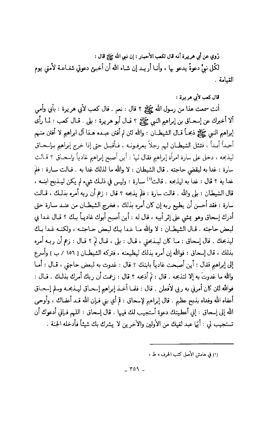 وعن ابن عباس قال: أن جبريل عليه السلام ذهب بإبراهيم إلى جمرة العقبة فعرض له الشيطان، فرماه بسبع حصيات، فساخ، ثم أتى به الجمرة الوسطى فعرض له الشيطان فرماه بسبع حصيات، فساخ، ثم أتى به الجمرة القصوى فعرض له الشيطان فرماه بسبع حصيات فساخ. فلما أراد إبراهيم أن يذبح إسحاق قال لأبيه: يا أبه، أوثقني لا أضطرب، فينضح عليك دمي إذا ذبحتني، فشده فلما أخذ الشفرة فأراد أن يذبحه نودي أن يا إبراهيم قد صدقت الرؤيا.