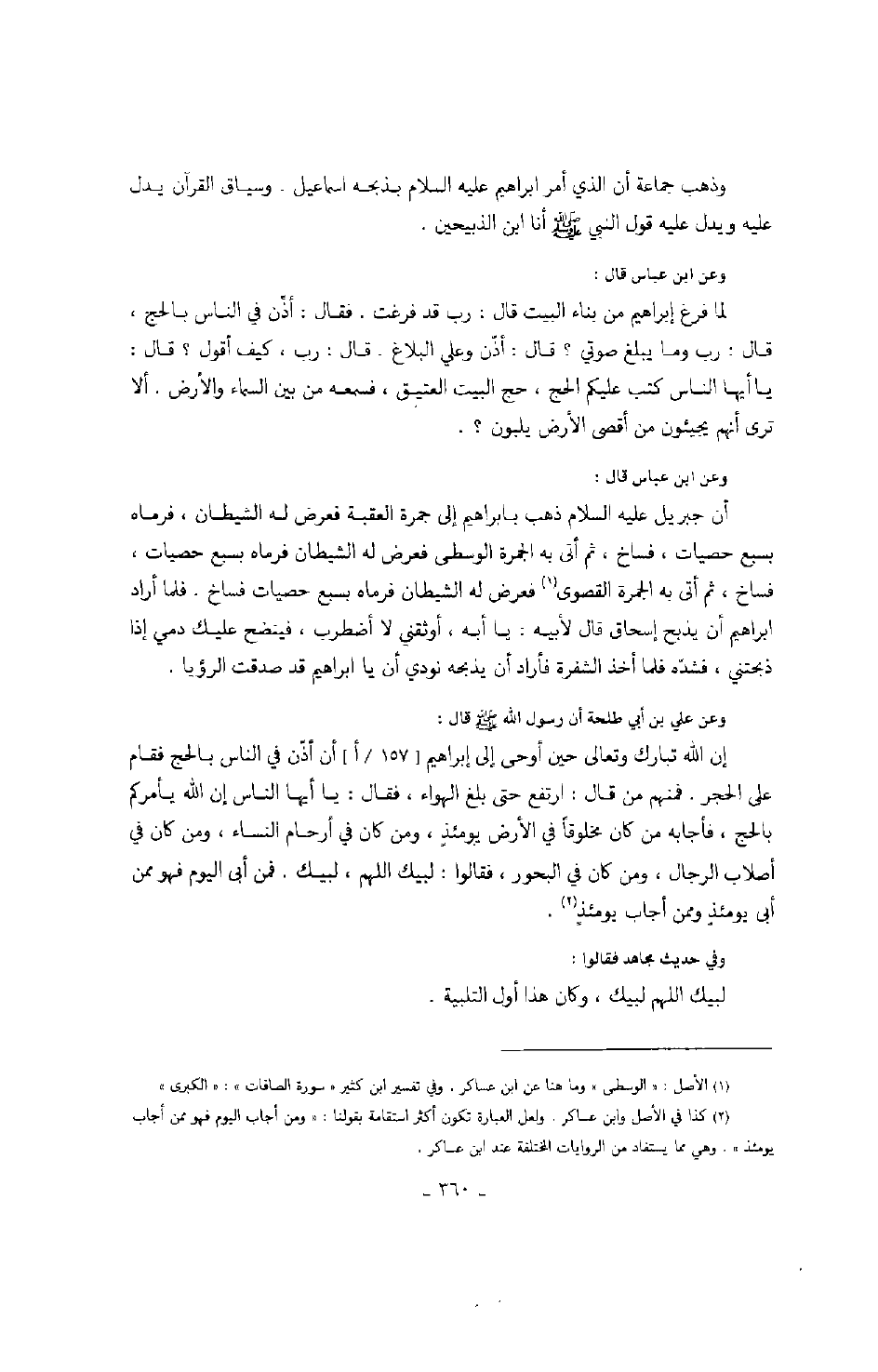 وعن عبد الله بن عمرو قال: لما أفاض جبريل عليه السلام بإبراهيم صَلَّى اللهُ عَلَيْهِ وَسَلَّمَ إلى منى فصلى بها الظهر والعصر والمغرب والعشاء والصبح، ثم غدا من منى إلى عرفات فصلى بها الصلاتين، ثم وقف حتى غابت الشمس، ثم أتى به المزدلفة، فنزل بها، فبات، ثم صلى بها يعني الصبح كأعجل ما يصلي أحد من المسلمين، ثم وقف به كأبطأ ما يصلي أحد من المسلمين، ثم دفع إلى منى فرمى، وذبح، وحلق، ثم أوحى الله عز وجل إلى محمد صَلَّى اللهُ عَلَيْهِ وَسَلَّمَ " أن اتبع ملة إبراهيم حنيفاً وما كان من المشركين " وفي رواية أخرى: ثم أفاض حتى أتى به الجمرة فرماها، ثم ذبح وحلق، ثم أتى به البيت فطاف به. قال: ثم رجع إلى منى، فأقام بها تلك الأيام، ثم أوحى الله إلى محمد صَلَّى اللهُ عَلَيْهِ وَسَلَّمَ " أن اتبع ملة إبراهيم حنيفاً ".