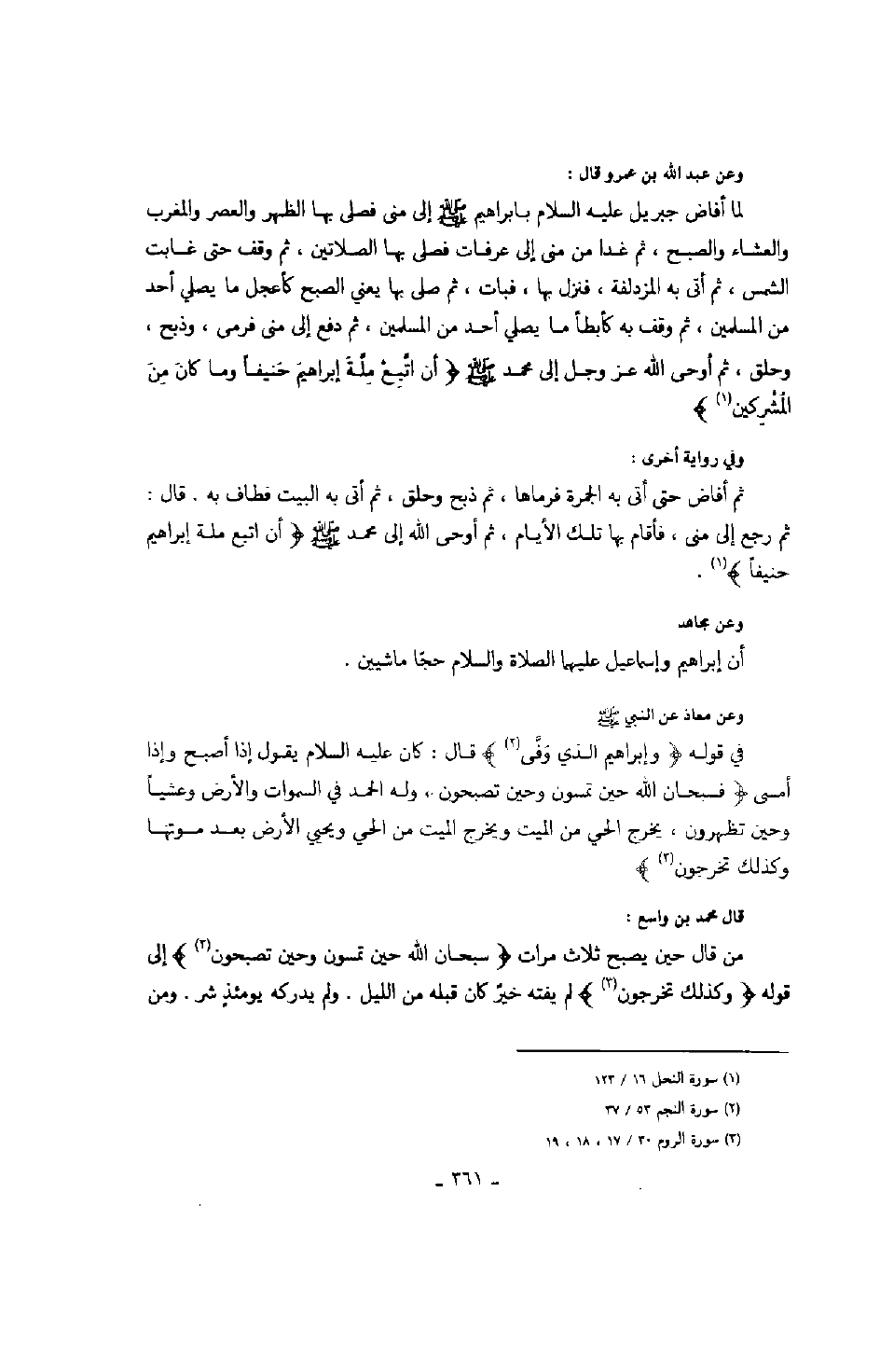 وعن عمرو بن أوس قال: كان الرجل يؤخذ بذنب غيره حتى جاء إبراهيم فقال الله عز وجل " وإبراهيم الذي وفى ألا تزر وازرة وزر أخرى " وعن ابن عباس قال: إن الله اصطفى إبراهيم بالخلة، واصطفى موسى بالكلام، واصطفى محمداً صَلَّى اللهُ عَلَيْهِ وَسَلَّمَ بالرؤية.