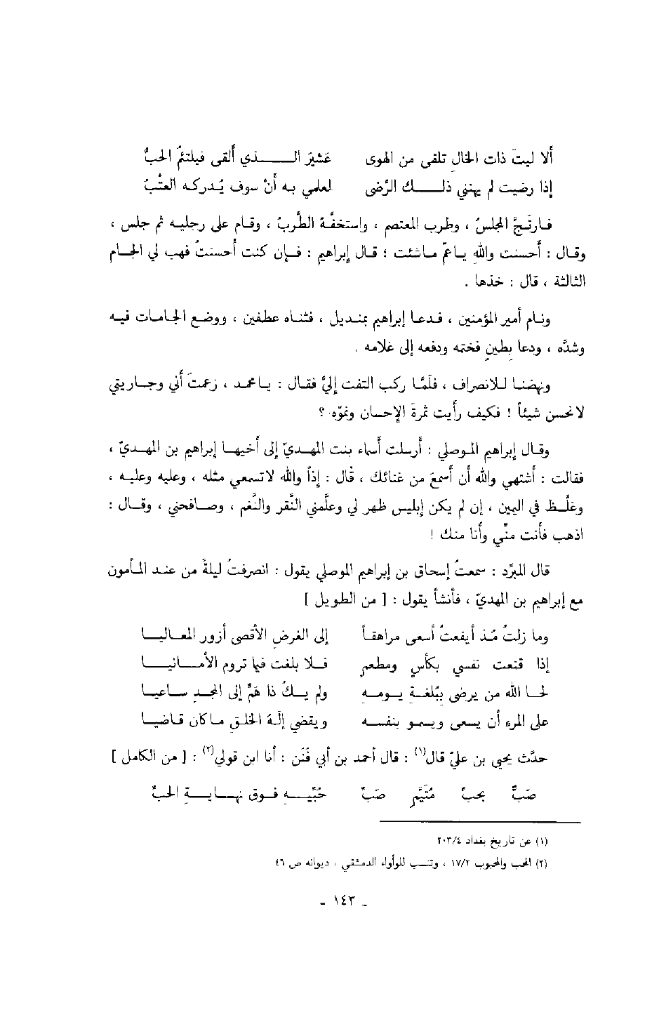 ونهضنا لانصراف، فلّما ركب التفت إليّ فقال: يا محمد، زعمت أني وجاريتي لا نحسن شيئاً! فكيف رأيت ثمرة الإحسان ونموّه؟ وقال إبراهيم الموصلي: أرسلت أسماء بنت المهديّ إلى أخيها إبراهيم بن المهديّ، فقالت: أشتهي والله أن أسمع من غنائك، قال: إذاً والله لا تسمعي مثله، وعليه وعليه، وغلّظ في اليمين، إن لم يكن إبليس ظهر لي وعلّمني النقّر والنّغم، وصافحني، وقال: اذهب فأنت منّي وأنا منك! قال المبرّد: سمعت إسحاق بن إبراهيم الموصلي يقول: انصرفت ليلةً من عند المأمون مع إبراهيم بن المهديّ، فأنشأ يقول: من الطويل