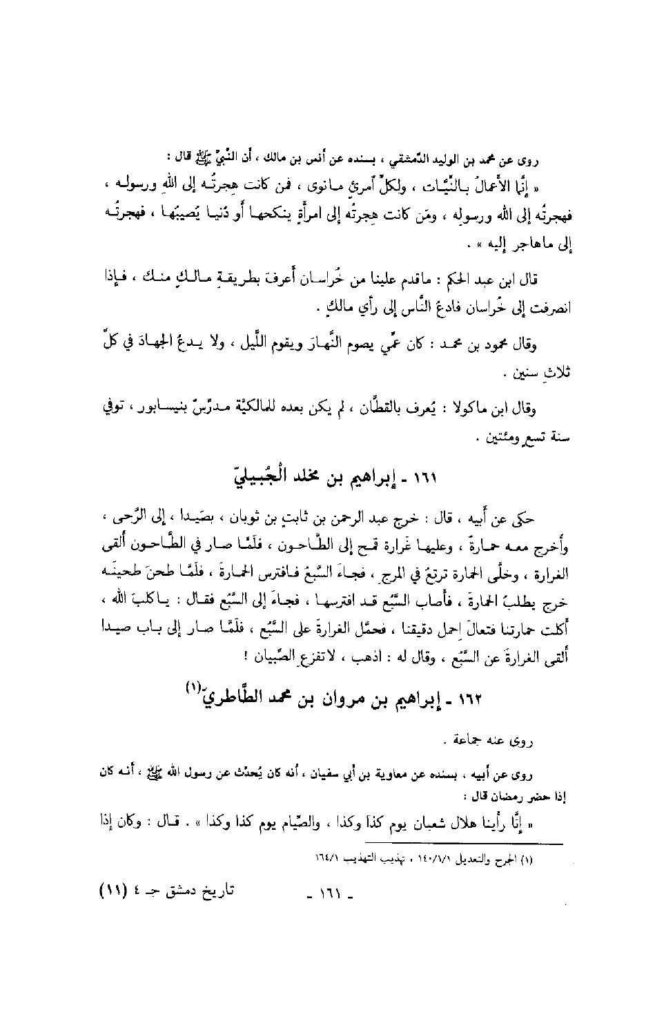 روى عن محمد بن الوليد الدّمشقي، بسنده عن أنس بن مالك، أن النبيّ صَلَّى اللهُ عَلَيْهِ وَسَلَّمَ قال: " إنّما الأعمال بالنيّات، ولكلّ امرئ ما نوى، فمن كانت هجرته إلى الله ورسوله، فهجرته إلى الله ورسوله، ومن كانت هجرته إلى امرأة ينكحها أو دنيا يصيبها، فهجرته إلى ما هاجر إليه ".
