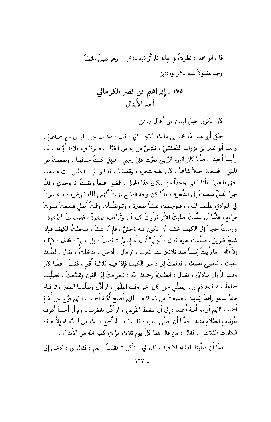حكى أبو عبد الله محمد بن مالك السّجستانيّ، قال: دخلت جبل لبنان مع جماعة، ومعنا أبو نصر بن بزراك الدّمشقيّ، نلتمس من به من العبّاد، فسرنا فيه ثلاثة أيّام، فما رأينا أحداً، فلّما كان اليوم الرّابع ضرّت عليّ رجلي، فإني كنت حافياً، وضعفت عن المشي، فصعدنا جبلاً شامخاً، كان عليه شجرة، وقعدنا، فقالوا لي: اجلس أنت ها هنا حتى نذهب لعلّنا نلقى واحداًمن سكّان هذا الجبل، فمضوا جميعاً وبقيت أنا وحدي، فلّما جنّ الليل صعدت إلى الشجرة، فلّما كان وجه الصّبح نزلت ألتمس الماء للوضوء، فانحدرت في الوادي لطلب الماء، فوجدت عيناً صغيرة، وتوضأت وقمت أصلي فسمعت صوت قراءة؛ فلّما أن سلّمت الأثر فرأيت كهفاً، وقدّامه صخرة، فصعدت الصّخرة، ورميت حجراً إلى الكهف خشية أن يكون فيه وحش، فلم أر شيئاً، فدخلت الكهف فإذا شيخ ضرير، فسلّمت عليه فقال: أجنّيّ أنت أم إنسيّ؟ فقلت: بل إنسيّ، فقال: لا إله إلاّ الله، ما رأيت إنسياً منذ ثلاثين سنة غيرك، ثم قال: ادخل، فدخلت، فقال: لعلّك تعبت، فاطرح نفسك، فدفعت إلى داخل الكهف فإذا فيه ثلاثة أقبر فلما كان وقت الزوال ناداني فقال: الصّلاة رحمك الله؛ فخرجت إلى العين وتمسّحت، فصلّينا جماعةً، ثم قام فلم يزل يصلّي حتى كان آخر وقت الظّهر، ثم أذّن وصلّينا العصر، ثم قام قائماً يدعو رافعاً يديه، فسمعت من دعائه: اللهم اصلح أمّة أحمد، اللهم فرّج عن أمّة أحمد، اللهم ارحم أمّة أحمد؛ إلى أن سقط القرص، ثم أذّن للمغرب ولم أر أحداً أعرف بأوقات الصّلاة منه فلّما أن صلّى المغرب قلت له: لم أسمع منك من الدّعاء إلاّ هذه الكلمات الثلاث!، فقال: من قال هذا كلّ يوم ثلاث مرّات كتبه الله من الأبدال.