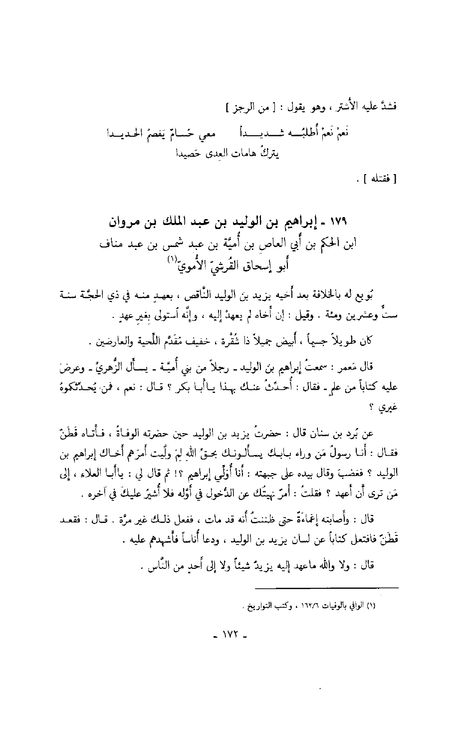 قال معمر: سمعت إبراهيم بن الوليد رجلاً من بني أمية يسأل الزّهريّ وعرض عليه كتاباً من علم فقال: أحدّث عنك بهذا يا أبا بكر؟ قال: نعم، فمن يحدثّكموه غيري؟ عن برد بن سنان قال: حضرت يزيد بن الوليد حين حضرته الوفاة، فأتاه قطن فقال: أنا رسول من وراء بابك يسألونك بحقّ الله لم ولّيت أمرهم أخاك إبراهيم بن الوليد؟ فغضب وقال بيده على جبهته: أنا أولّي إبراهيم؟! ثم قال لي: يا أبا العلاء، إلى من ترى أن أعهد؟ فقلت: أمر نهيتك عن الدّخول في أوّله فلا أشير عليك في آخره.