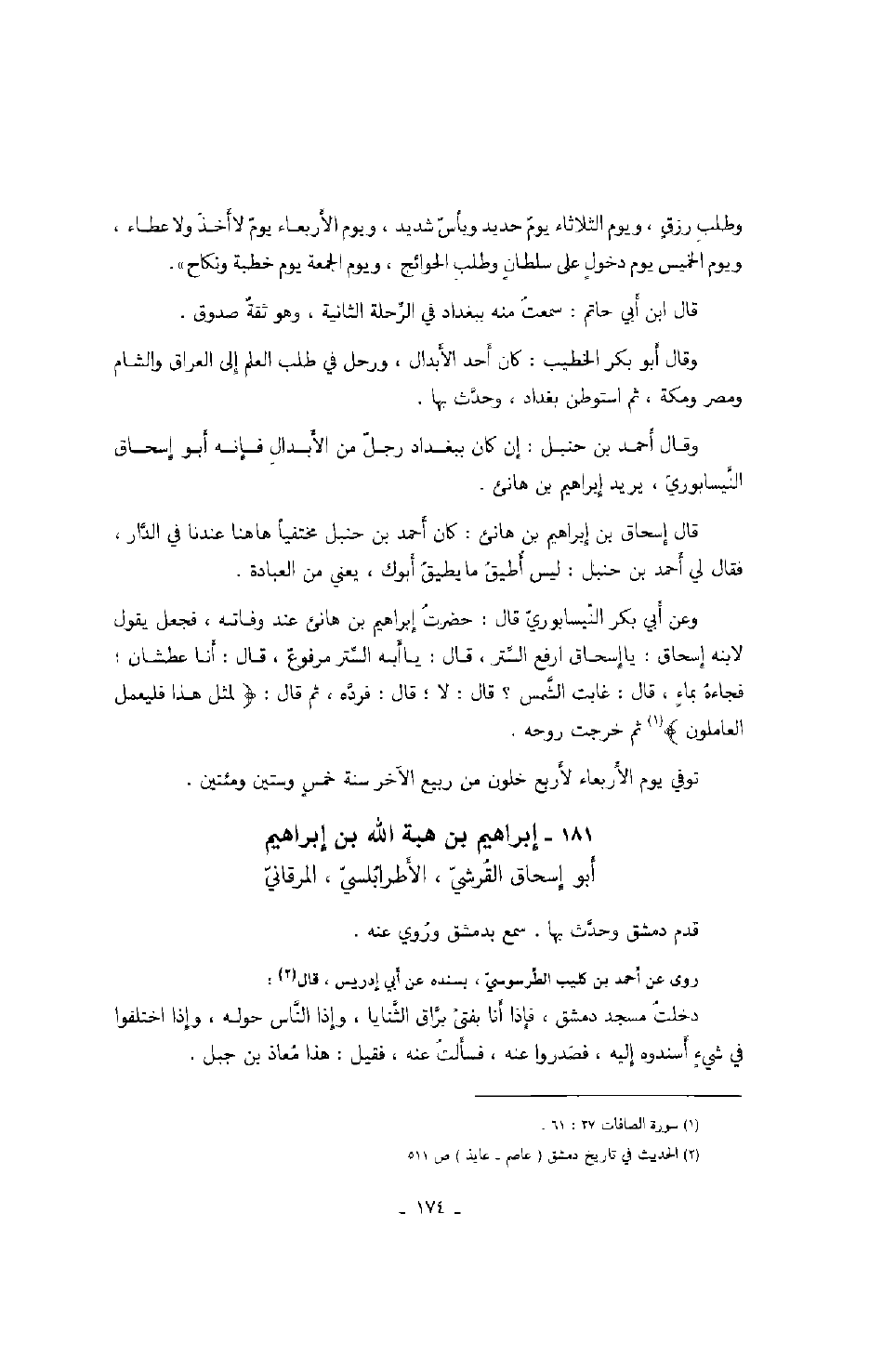 وقال أحمد بن حنبل: إن كان ببغداد رجل من الأبدال فإنه أبو إسحاق النّيسابوريّ، يريد إبراهيم بن هانئ.