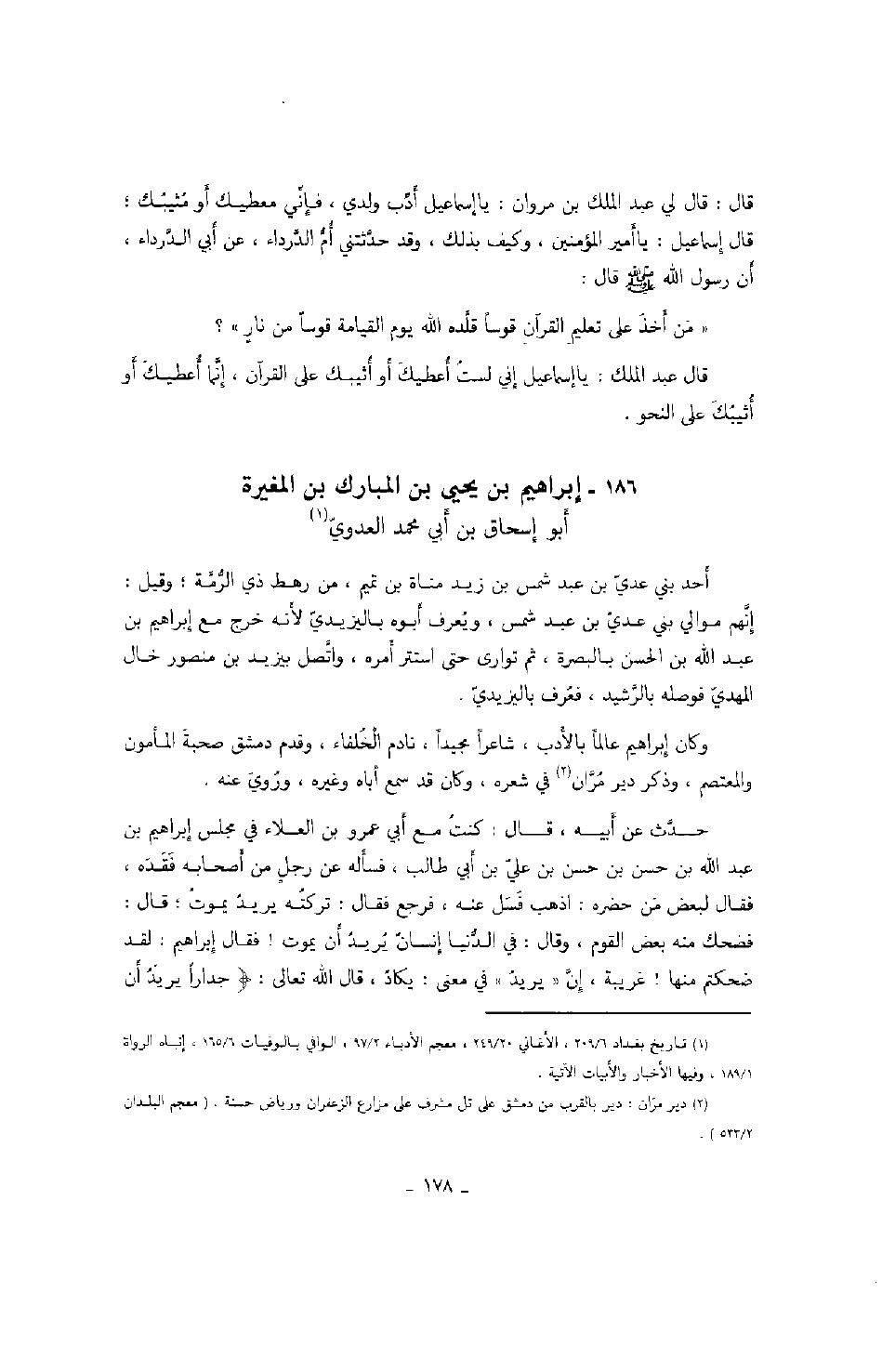 وكان إبراهيم عالماً بالأدب، شاعراً مجيداً، نادم الخلفاء، وقدم دمشق صحبة المأمون والمعتصم، وذكر دير مرّان في شعره، وكان قد سمع أباه وغيره، وروي عنه.