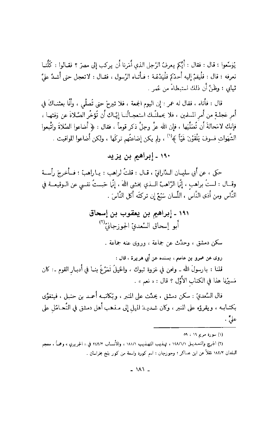 قال: فأتاه، فقال له عمر: إن اليوم الجمعة، فلا تبرح حتى تصلّي، وأنّا بعثناك في أمر عجلة من أمر المسلمين، فلا يحملّنك استعجالنا إيّاك أن تؤخر الصّلاة عن وقتها، فإنك لا محالة أن تصلّيها، فإن الله عزّ وجلّ ذكر قوماً، فقال: " أضاعوا الصّلاة واتّبعوا الشّهوات فسوف يلقون غيّاً "، ولم يكن إضاعتهم تركها، ولكن أضاعوا المواقيت.