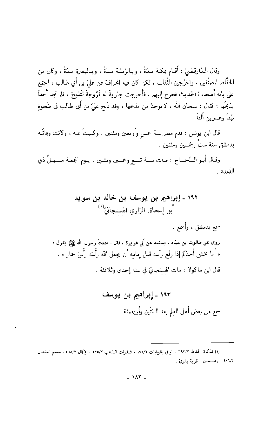 وقال الدّارقطني: أقام بمكة مدّة، وبالرّملة مدّة، وبالبصرة مدّة، وكان من الحفّاظ المصنّفين، والمخرّجين الثّقات، لكن كان فيه انحراف عن عليّ بن أبي طالب، اجتمع على بابه أصحاب الحديث فخرج إليهم، فأخرجت جارية له فرّوجة لتذبح، فلم تجد أحداً يذبحها؛ فقال: سبحان الله، لا يوجد من يذبحها، وقد ذبح عليّ بن أبي طالب في ضحوة نيفاً وعشرين ألفاً.