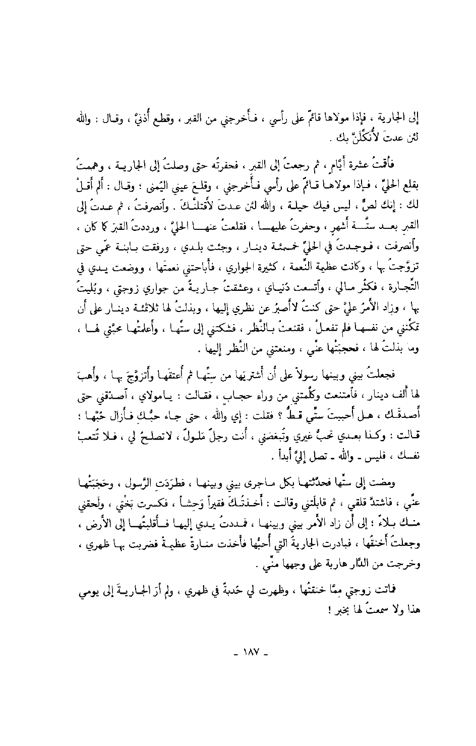 فجعلت بيني وبينها رسولاً على أن أشتريها من ستّها ثم أعتقها وأتزوّج بها، وأهب لها ألف دينار، فامتنعت وكلّمتني من وراء حجاب، فقالت: يا مولاي: اصدقني حتى أصدقك، هل أحببت ستّي قطّ؟ فقلت: إي والله، حتى جاء حبّك فأزال حبّها؛ قالت: وكذا بعدي تحبّ غيري وتبغضني، أنت رجل ملول، لا تصلح لي، فلا تتعب نفسك، فليس والله تصل إليّ أبداً.