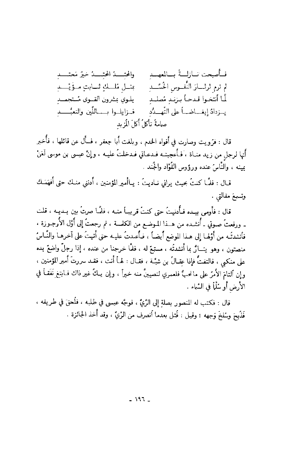 صمامة تأكل أكل المزبد قال: فرويت وصارت في أفواه الخدم، وبلغت أبا جعفر، فسأل عن قائلها، فأخبر أنها لرجل من زيد مناة، فأعجبته فدعاني فدخلت عليه، وإنّ عيسى بن موسى لعن يمينه، والنّاس عنده ورؤوس القّواد والجند.