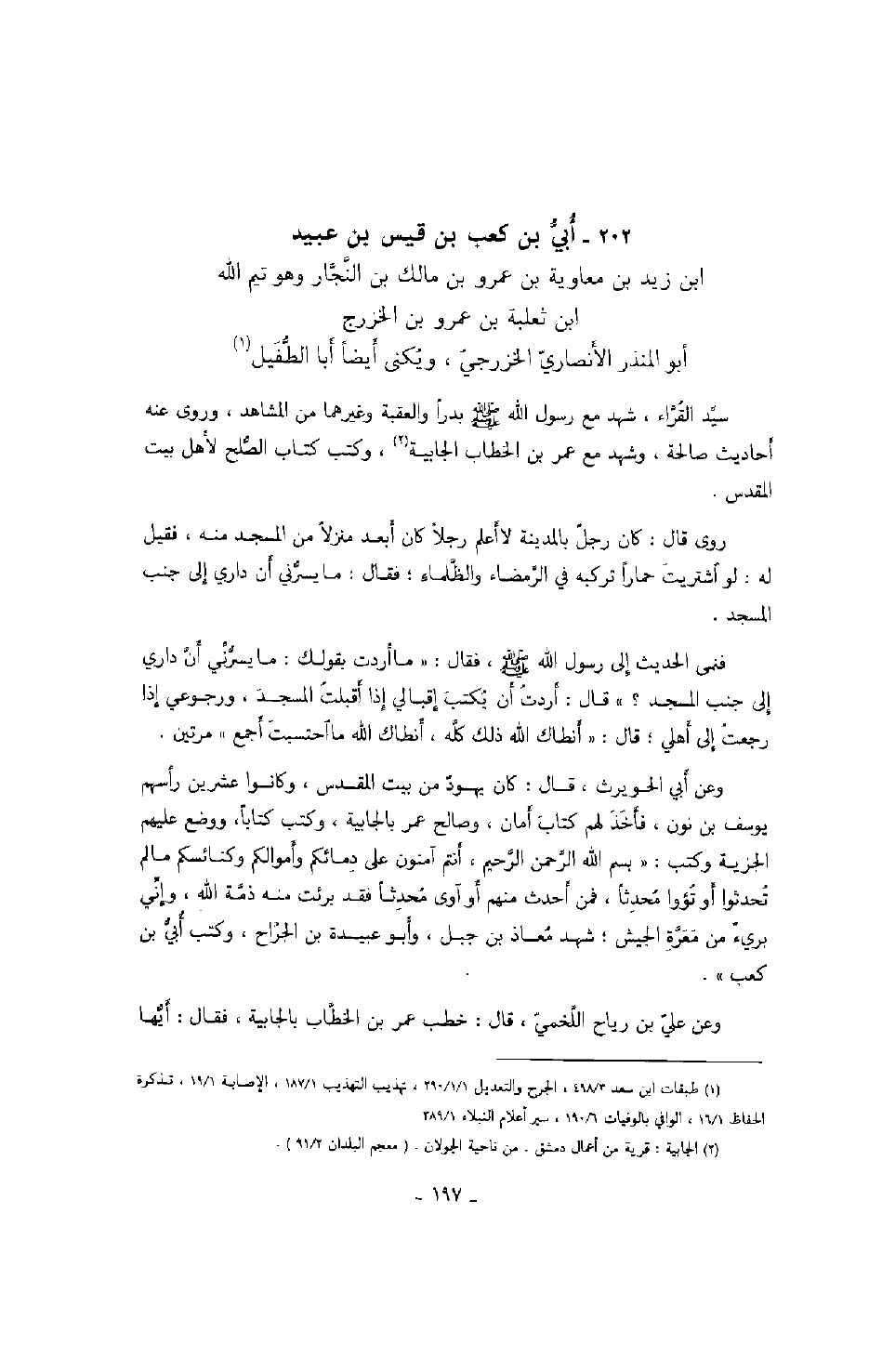 وعن أبي الحويرث، قال: كان يهود من بيت المقدس، وكانوا عشرين رأسهم يوسف بن نون، فاخذ لهم كتاب أمان، وصالح عمر بالجابية، وكتب كتاباً، ووضع عليهم الجزية وكتب: بسم الله الرّحمن الرحيم، أنتم آمنون على دمائكم وأموالكم وكنائكسم ما لم تحدثوا أو تؤوا محدثاً، فمن أحدث منهم أو آوى محدثاً فقد برئت منه ذمّة الله، وإنّي بريء من معرّة الجيش؛ شهد معاذ بن جبل، وأبو عبيدة بن الجرّاح، وكتب أبيّ بن كعب.