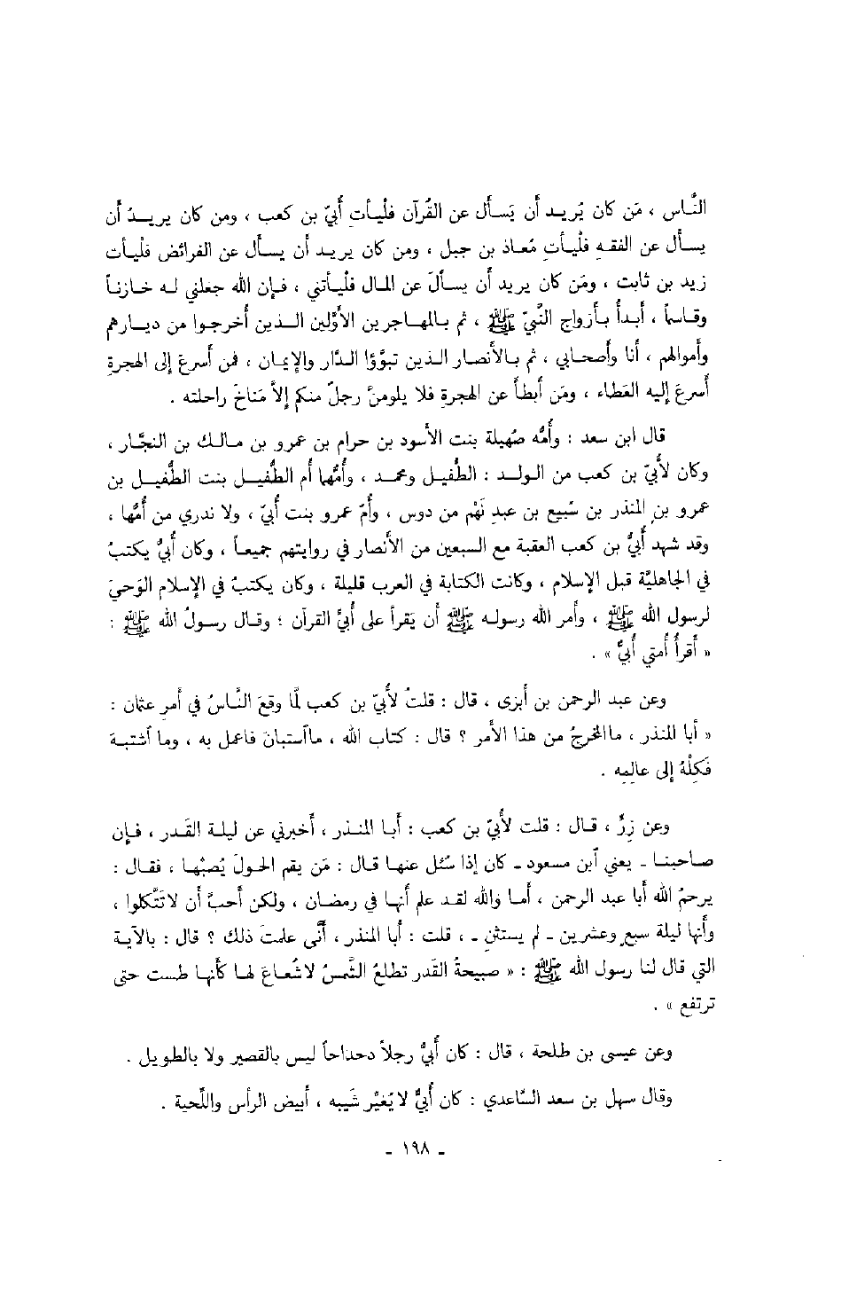 قال ابن سعد: وأمّه صهيلة بنت الأسود بن حرام بن عمرو بن مالك بن النّجار، وكان لأبيّ بن كعب من الولد: الطّفيل ومحمد، وأمهّما أمّ الطّفيل بنت الطّفيل بن عمرو بن المنذر بن سبيع بن عبد نهم من دوس، وأمّ عمرو بنت أبيّ، ولا ندري من أمّها، وقد شهد أبيّ بن كعب العقبة مع السبعين من الأنصار في روايتهم جميعاً، وكان أبيّ يكتب في الجاهليّة قبل الإسلام، وكانت الكتابة في العرب قليلة، وكان يكتب في الإسلام الوحي لرسول الله صَلَّى اللهُ عَلَيْهِ وَسَلَّمَ، وأمر الله رسوله صَلَّى اللهُ عَلَيْهِ وَسَلَّمَ أن يقرأ على أبيّ القرآن؛ وقال رسول الله صَلَّى اللهُ عَلَيْهِ وَسَلَّمَ: " أقرأ أمتي أبيّ ".
