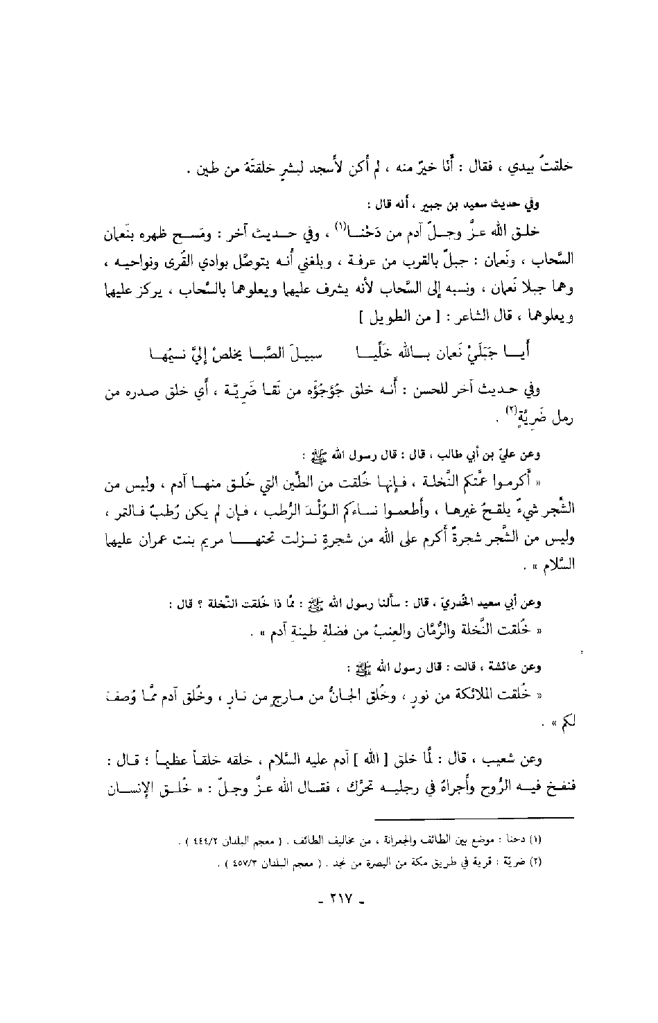 وفي حديث سعيد بن جبير، أنه قال: خلق الله عزّ وجلّ آدم من دحنا، وفي حديث آخر: ومسح ظهره بنعمان السّحاب، ونعمان: جبل بالقرب من عرفة، وبلغني أنه يتوصّل بوادي القرى ونواحيه، وهما جبلا نعمان، ونسبه إلى السّحاب لأنه يشرف عليهما ويعلوهما بالسّحاب، يركز عليهما ويعلوهما، قال الشاعر: منالطويل