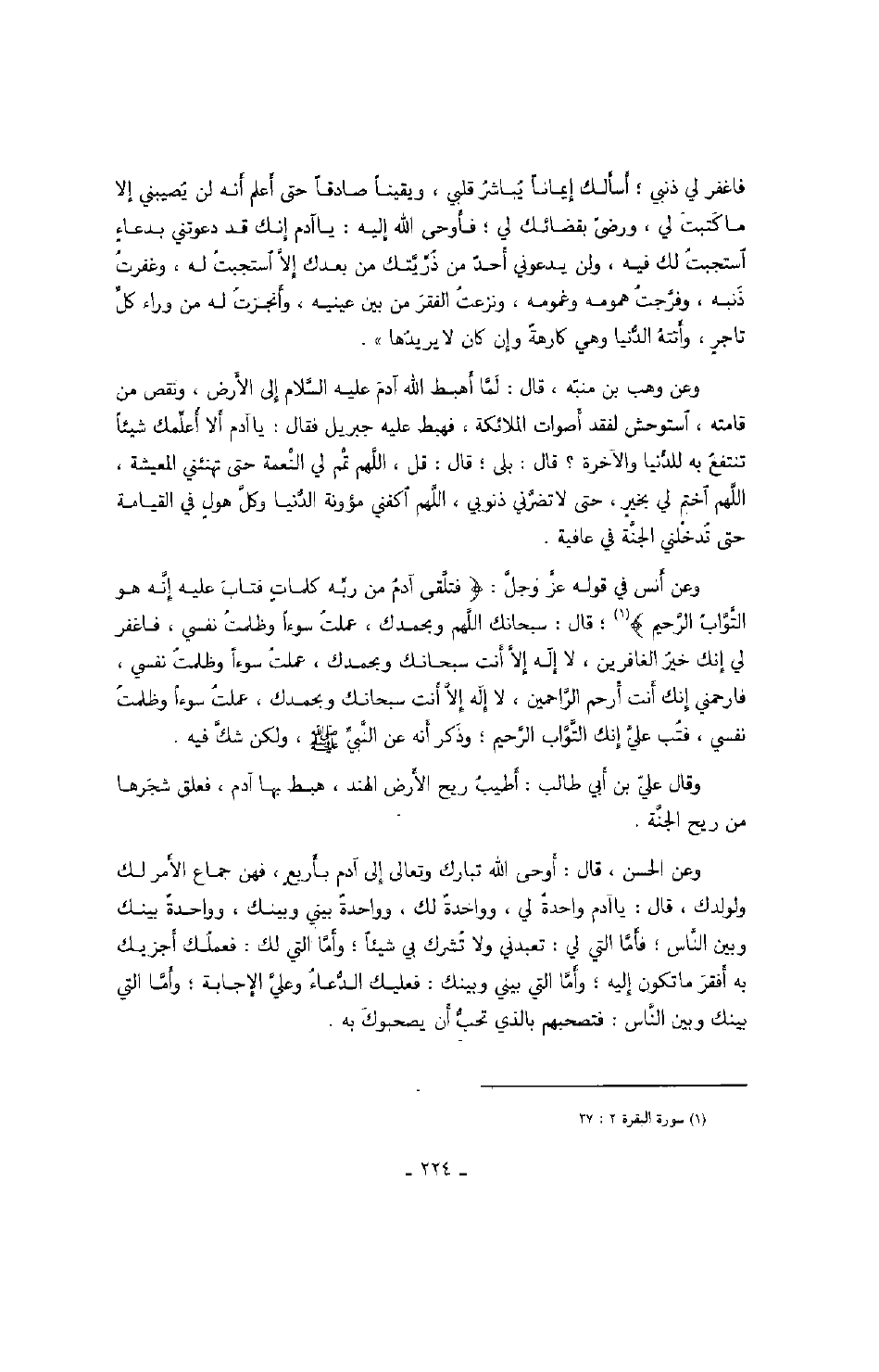 وعن أنس في قوله عزّ وجلّ: فتلّقى آدم من ربّه كلمات فتاب عليه إنّه هو التّوّاب الرّحيم "؛ قال: سبحانك اللهم وبحمدك، عملت سوءاً وظلمت نفسي، فاغفر لي إنك خير الغافرين، لا إله إلاّ أنت سبحانك وبحمدك، عملت سوءاً وظلمت نفسي، فارحمني إنك أنت أرحم الرّاحمين، لا إله إلاّ أنت سبحانك وبحمدك، عملت سوءاً وظلمت نفسي، فتب عليّ إنك التّوّاب الرّحيم، وذكر أنه عن النّبيّ صَلَّى اللهُ عَلَيْهِ وَسَلَّمَ، ولكن شكّ فيه.