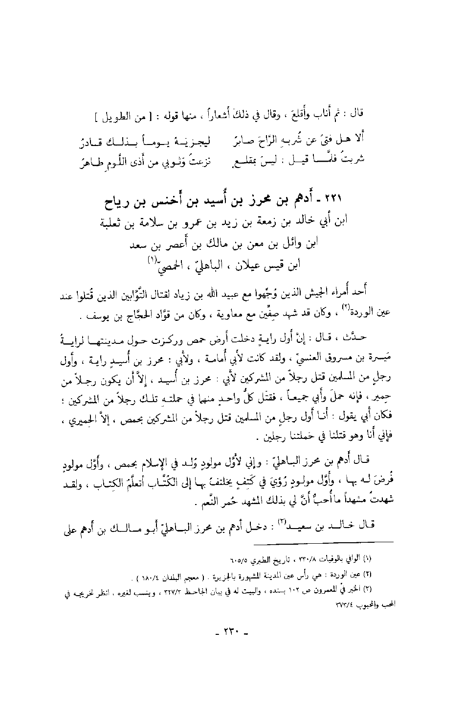 قال أدهم بن محرز الباهليّ: وإني لأوّل مولود ولد في الإسلام بحمص، وأوّل مولود فوض له بها، وأوّل مولود رؤي في كتف يختلف بها إلى الكتّاب أتعلّم الكتاب، ولقد شهدت مشهداً ما أحبّ أنّ لي بذلك المشهد حمر النّعم.