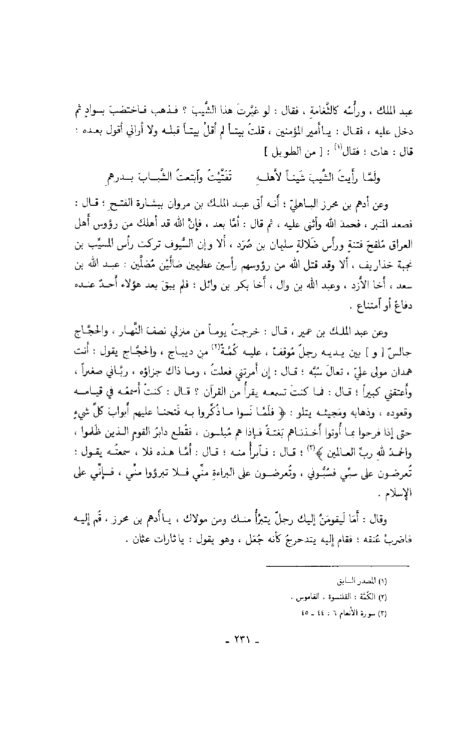 عبد الملك، ورأسه كالثغامة، فقال: لو غيّرت هذا الشّيب؟ فذهب فاختضب بسواد ثم دخل عليه، فقال: يا أمير المؤمنين، قلت بيتاً لم أقل قبله ولا أراني أقول بعده؛ قال: هات؛ فقال: من الطويل