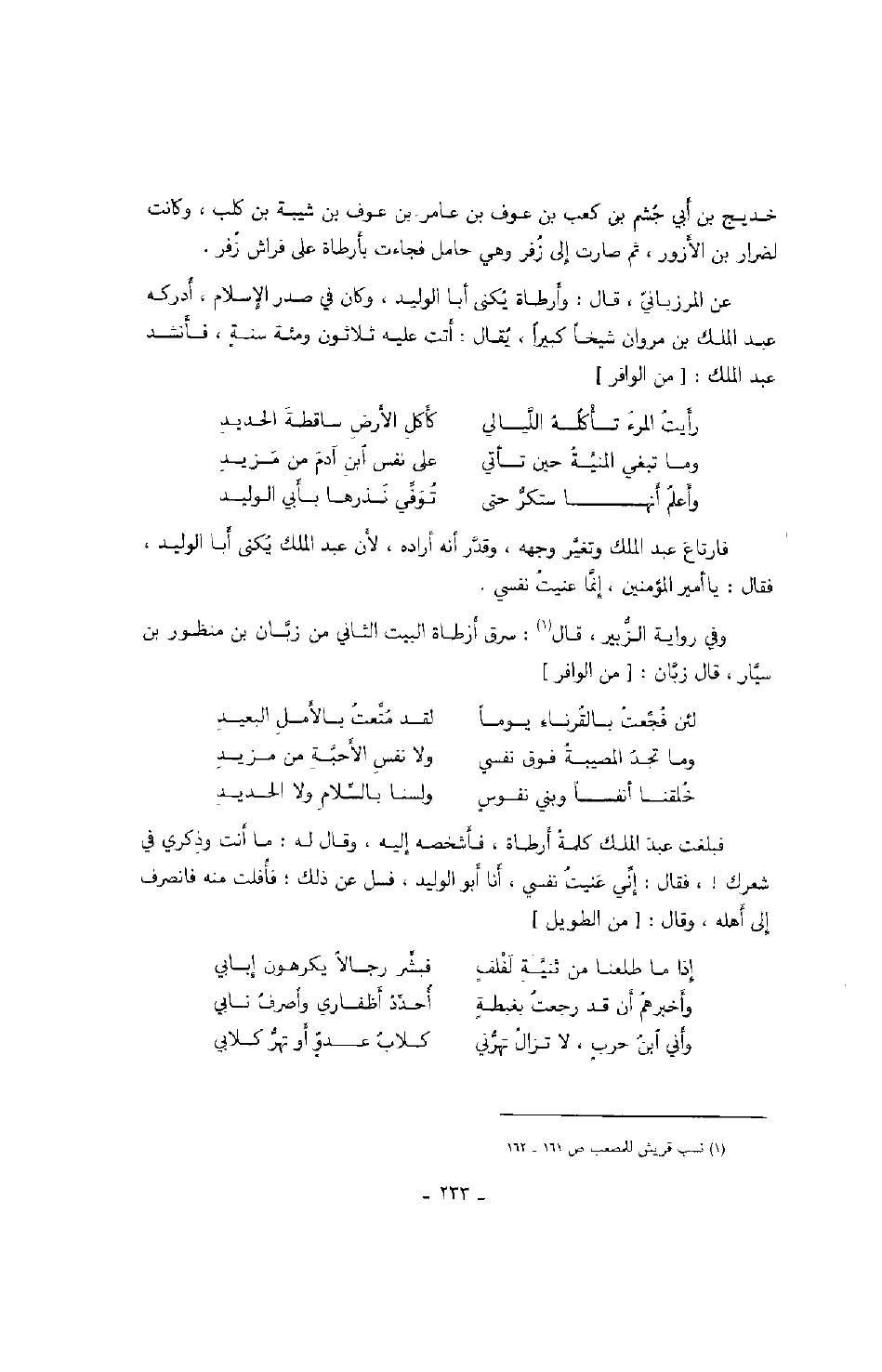 عن المرزبانيّ، قال: وأرطاة يكنى أبا الوليد، وكان في صدر الإسلام، أدركه عبد الملك بن مروان شيخاً كبيراً، يقال: أتت عليه ثلاثون ومئة سنة، فأنشد عبد الملك: من الوافر