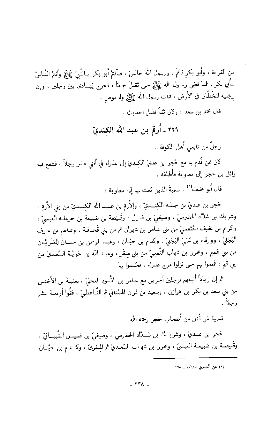 تسمية من قتل أصحاب حجر رحمه الله: حجر بن عدي، وشريك بن شداد الحضرمي، وصيفي بن فسيل الشيباني، وقبيصة بن ضبيعة العبسي، ومحرز بن شهاب السعدي ثم المنقري، وكدام بن حيان