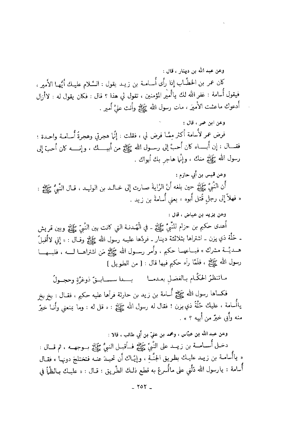 وعن ابن عمر، قال: فرض عمر لأسامة أكثر مما فرض لي، فقلت: إنما هجرتي وهجرة أسامة واحدة؛ فقال: إن أباه كان أحب إلى رسول الله صَلَّى اللهُ عَلَيْهِ وَسَلَّمَ من أبيك، وإنه كان أحب إلى رسول الله صَلَّى اللهُ عَلَيْهِ وَسَلَّمَ منك، وإنما هاجر بك أبواك.