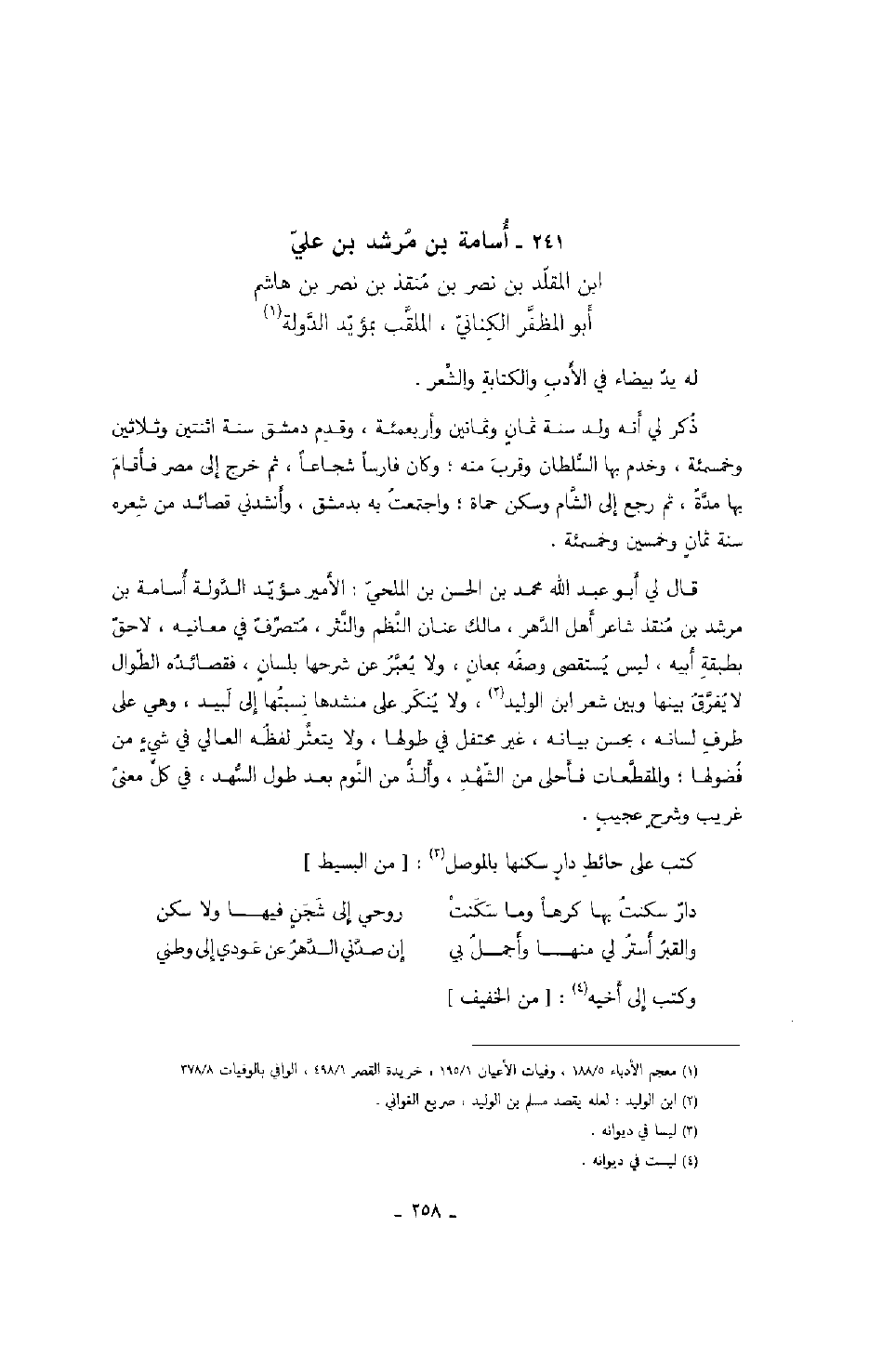 ابن المقلد بن نصر بن منقذ بن نصر بن هاشم أبو المظفر الكناني، الملقب بمؤيد الدولة له يد بيضاء في الأدب والكتابة والشعر.