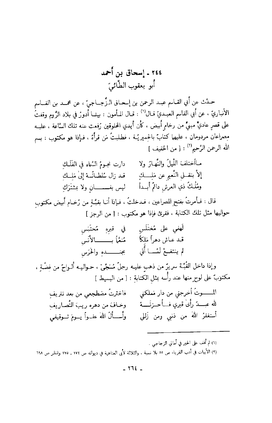 حدث عن أبي القاسم عبد الرحمن بن إسحاق الزجاجي، عن محمد بن القاسم الأنباري، عن أبي القاسم العبدي قال: قال المأمون: بينما أدور في بلاد الروم وقفت على قصر عادي مبني من رخام أبيض، كأن أيدي المخلوقين رفعت عنه تلك الساعة، عليه مصراعان مردومان، عليهما كتاب بالحميرية، فطلبت من قرأه، فإذا هو مكتوب: بسم الله الرحمن الرحيم: من الخفيف